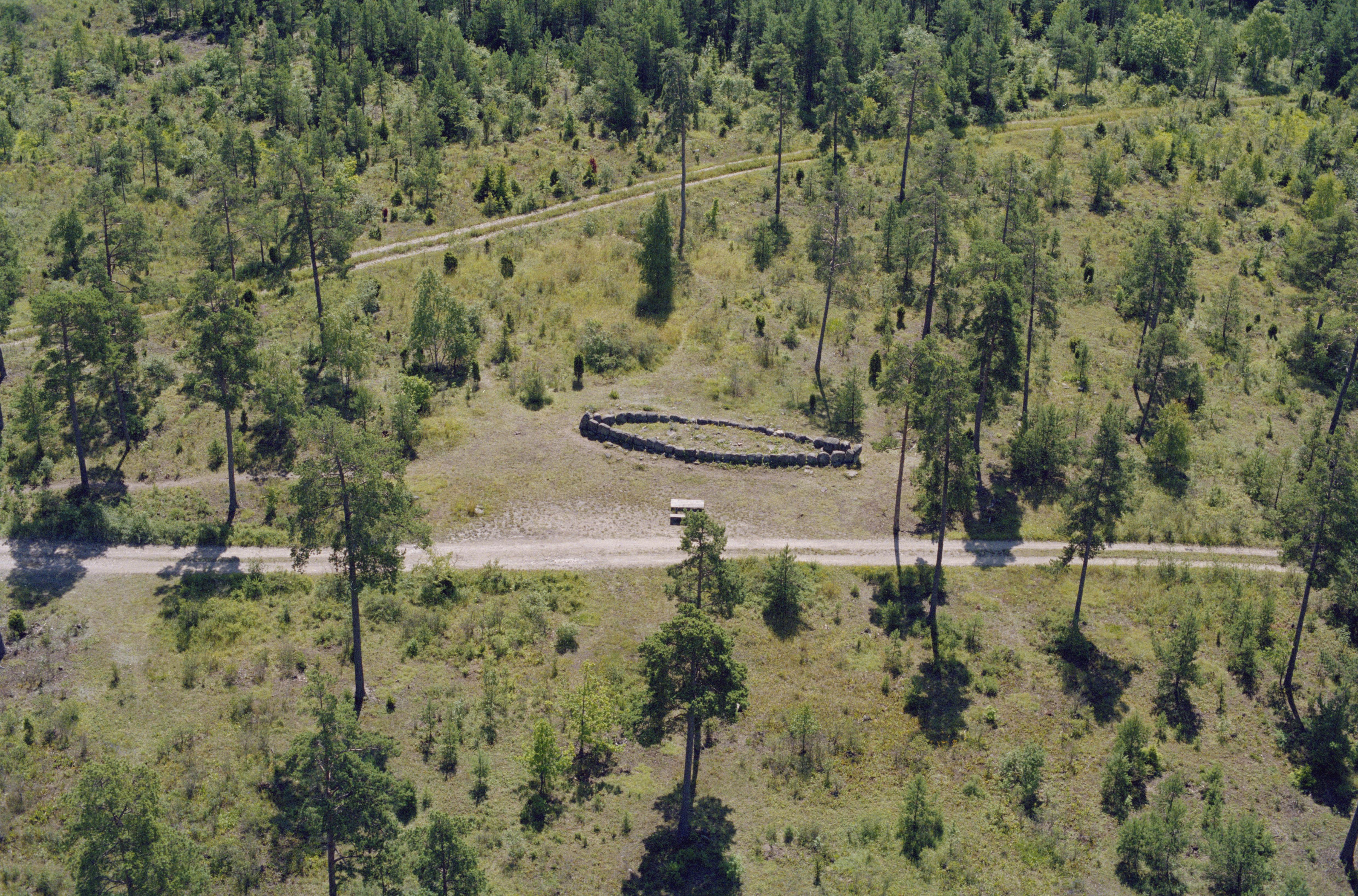 Beskrivning: Skeppssättningen Tjelvars grav RAÄnr Boge 28:1 i skogen vid Millhagen i Gothems socken, norr om gränsen mot Boge socken. Bilden är tagen mot (väderstreck): SSO