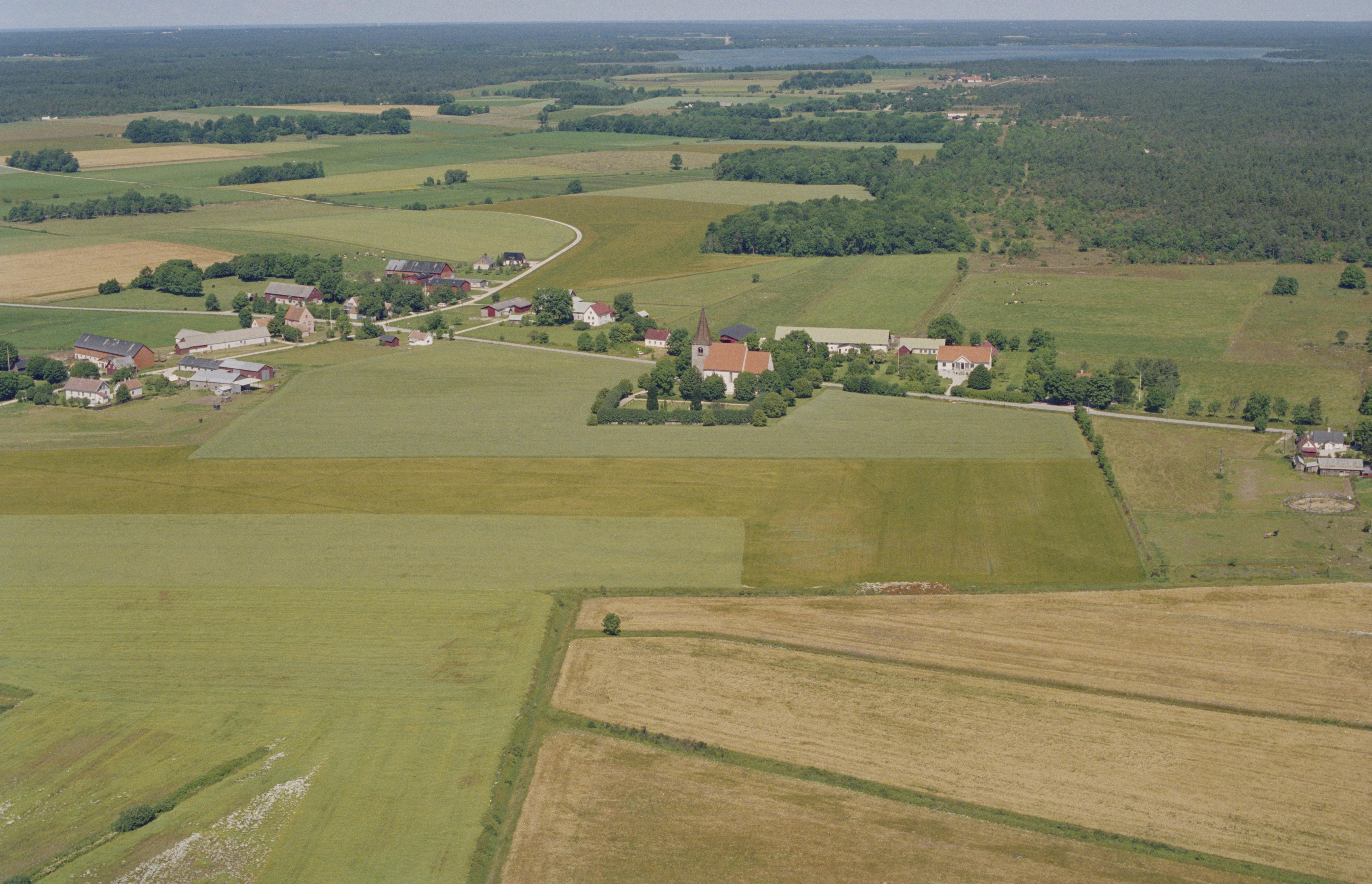 Beskrivning: Hejnums kyrkby. Hejnums kyrka, prästgård och hembygdsgård vid bildens mitt. Till vänster gårdarna Stora och Lilla Kyrkebys. Över bildens mitt bytomt RAÄnr Hejnum 219:1. Sjön Tingstäde träsk i Tingstäde socken uppe i bildens övre kant. Bilden är tagen mot (väderstreck): N