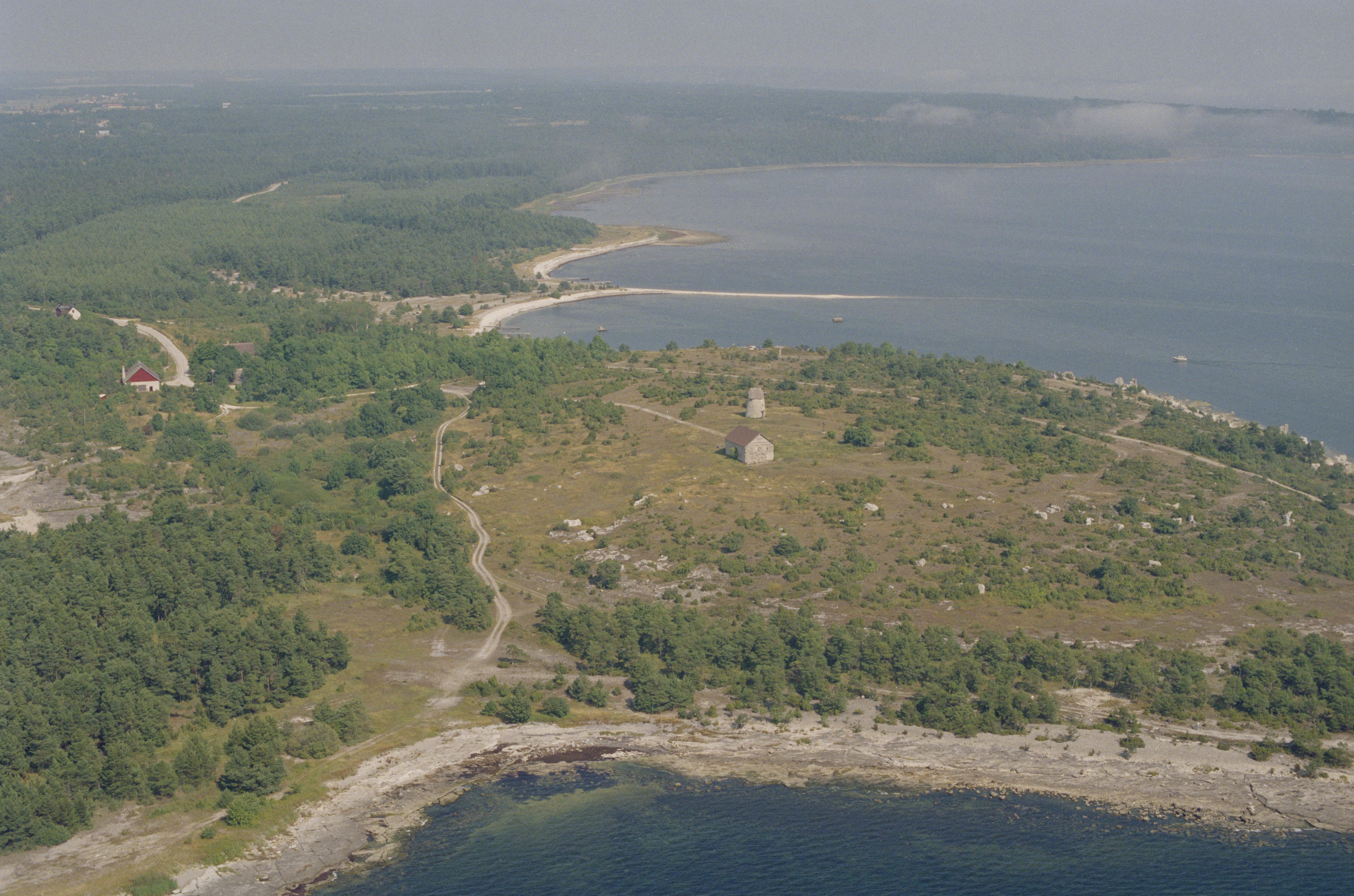 Beskrivning: Udden Sankt Olofsholm. Vid bildens mitt lämningar efter kalkindustri / kalkugn RAÄnr Hellvi 159:1, husgrunder, hamn, m.m. Till höger om bildens mitt lämningar efter Sankt Olofs kyrka RAÄnr Hellvi 60:1. Bilden är tagen mot (väderstreck): NNO