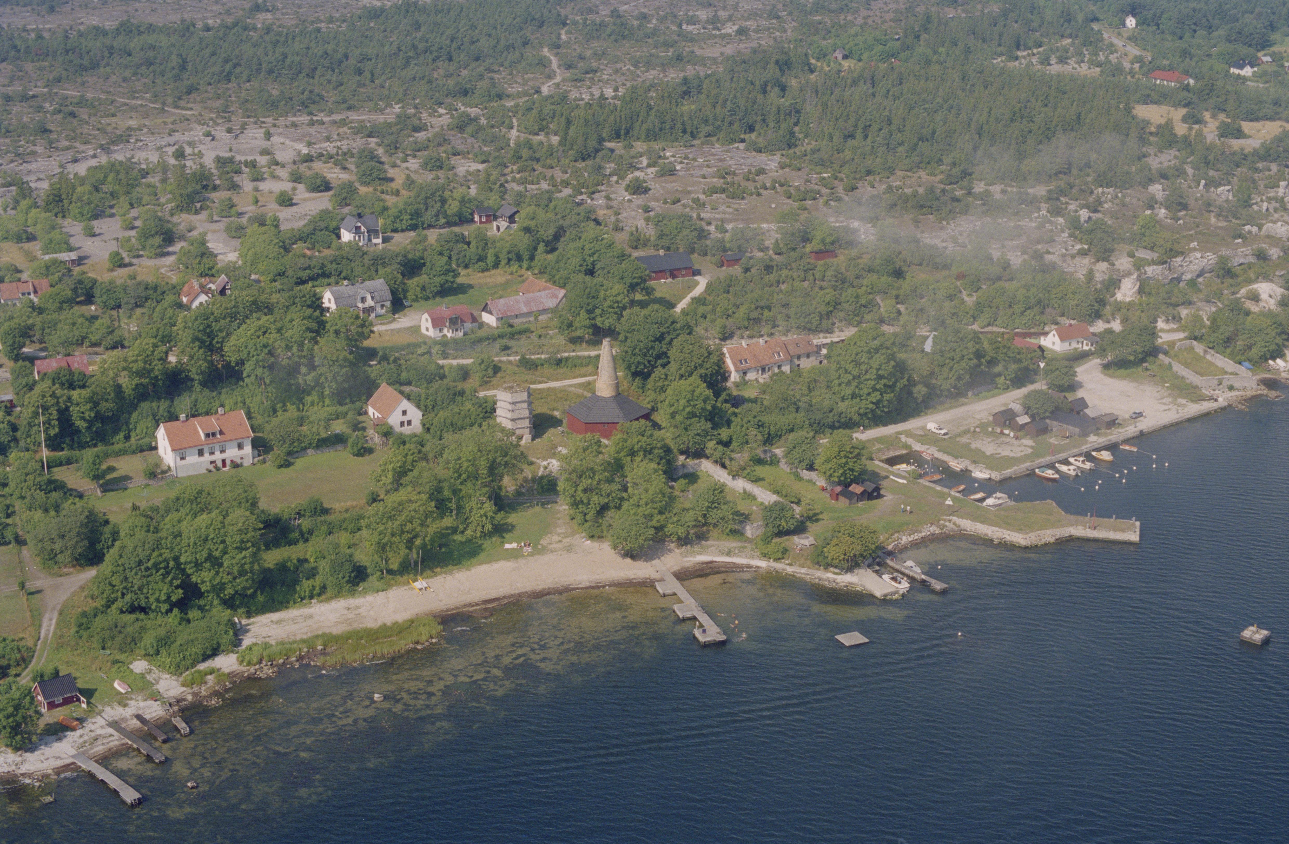 Beskrivning: Kyllaj by och hamn med lämningar efter kalkindustri. Vid bildens mitt kalkugnar RAÄnr Hellvi 173:1-3. Bilden är tagen mot (väderstreck): VNV