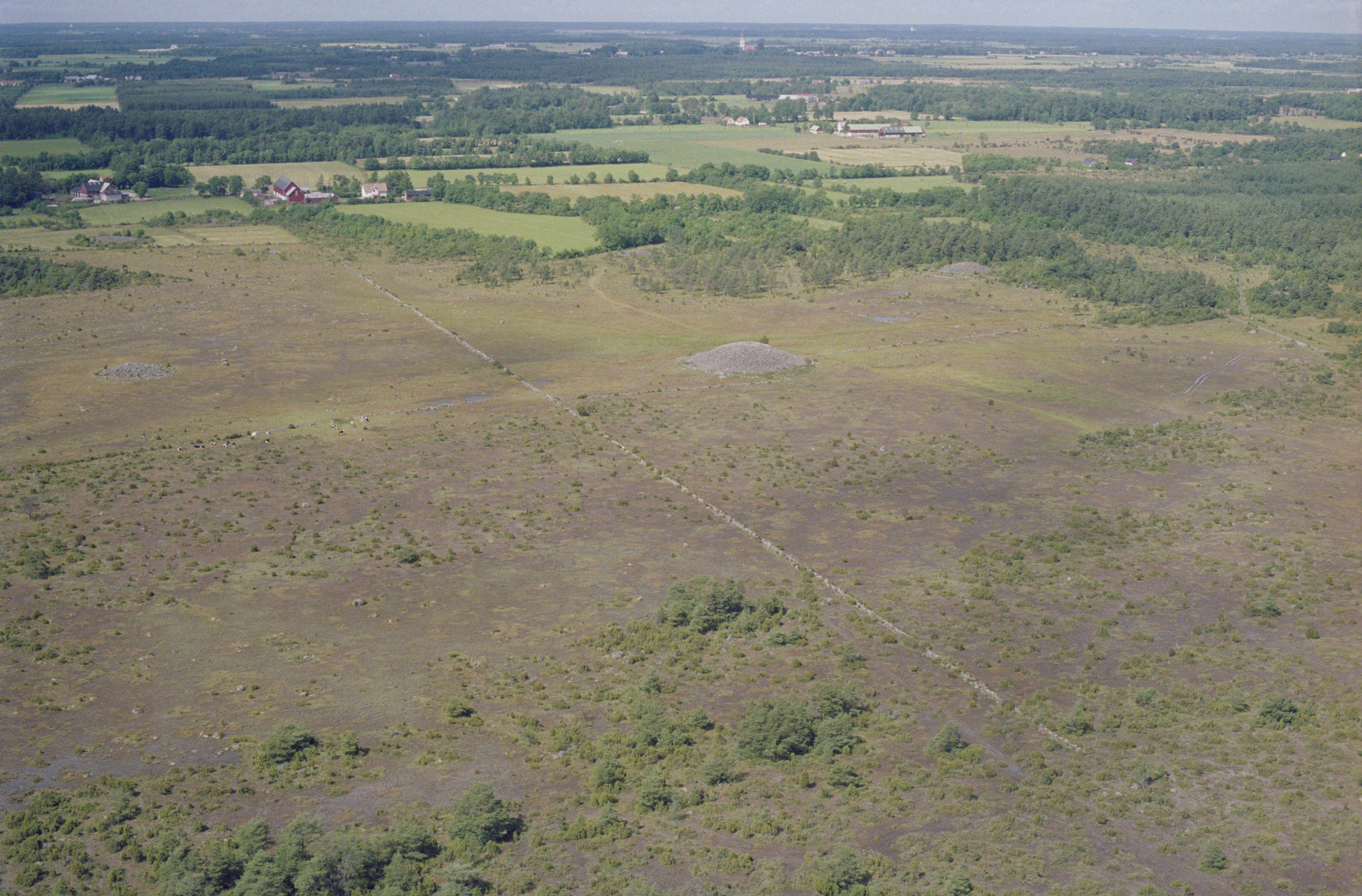 Beskrivning: Söder om Uggårde gård. Över bildens mitt gravröset RAÄnr Rone 10:1 Uggarde rojr (skrivs även: Uggarde råir / Uggarderojr / Uggarderåjr m.m.). Rone kyrka i bildens övre kant. Bilden är tagen mot (väderstreck): NNO