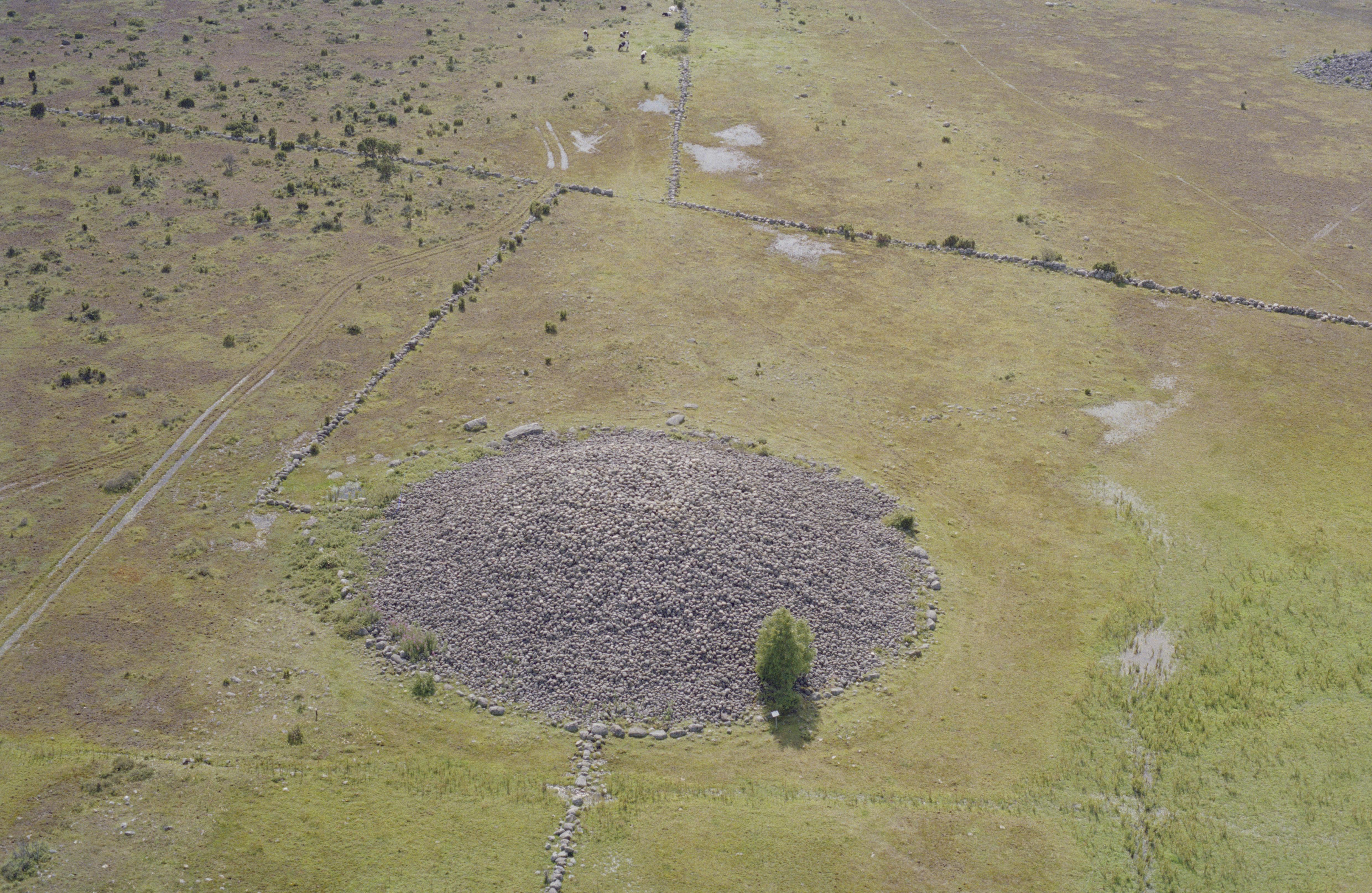 Beskrivning: Söder om Uggårde gård. Gravröset RAÄnr Rone 10:1 Uggarde rojr (skrivs även: Uggarde råir / Uggarderojr / Uggarderåjr m.m.). Bilden är tagen mot (väderstreck): SV