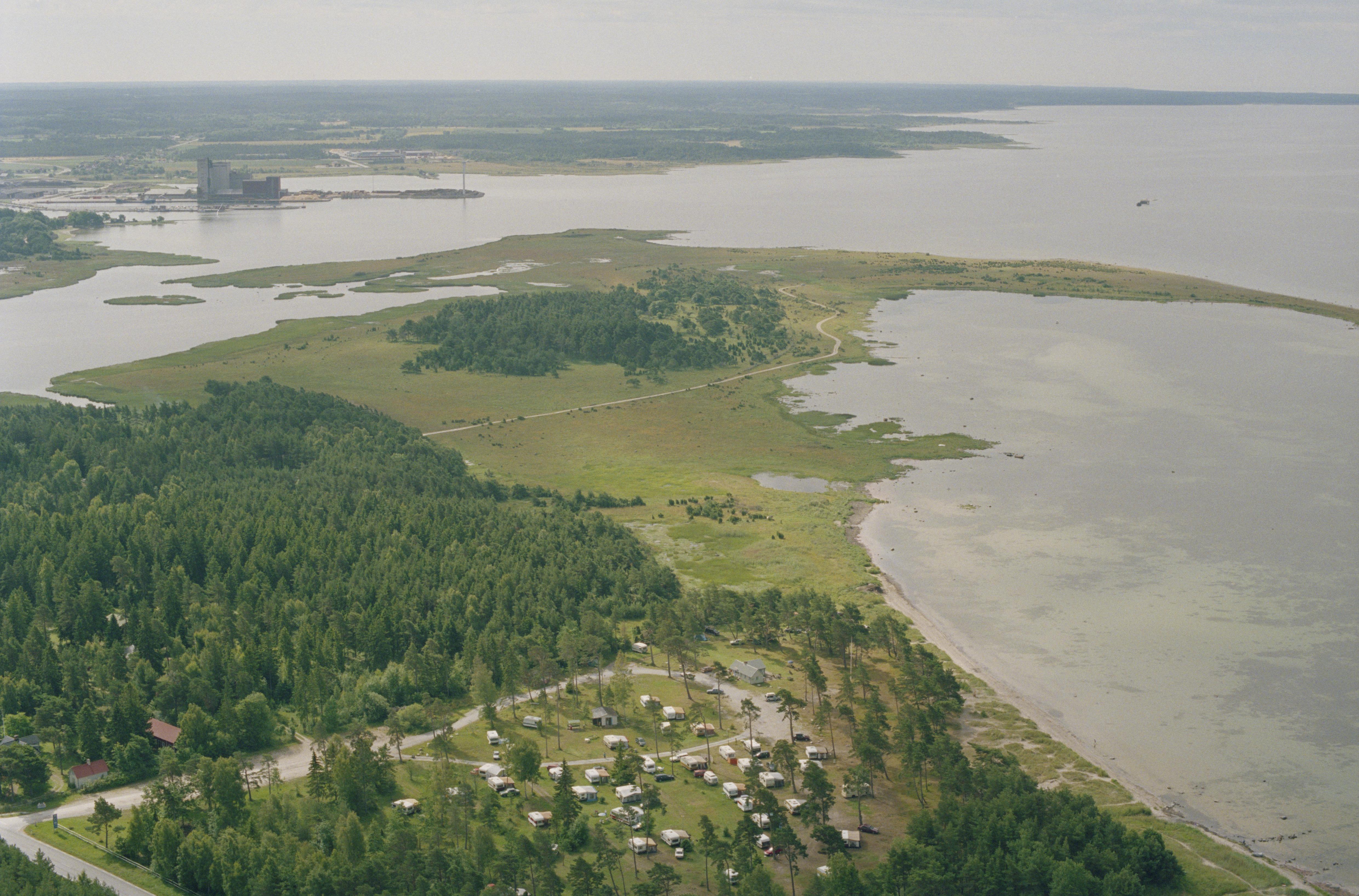Beskrivning: Vivesholms befästningsområde RAÄnr Sanda 122:1-4 med lämningar efter borg, vallar, hamn m.m, Sandboviken uppe till vänster. Klinte socken i bildens övre kant. Bilden är tagen mot (väderstreck): SO