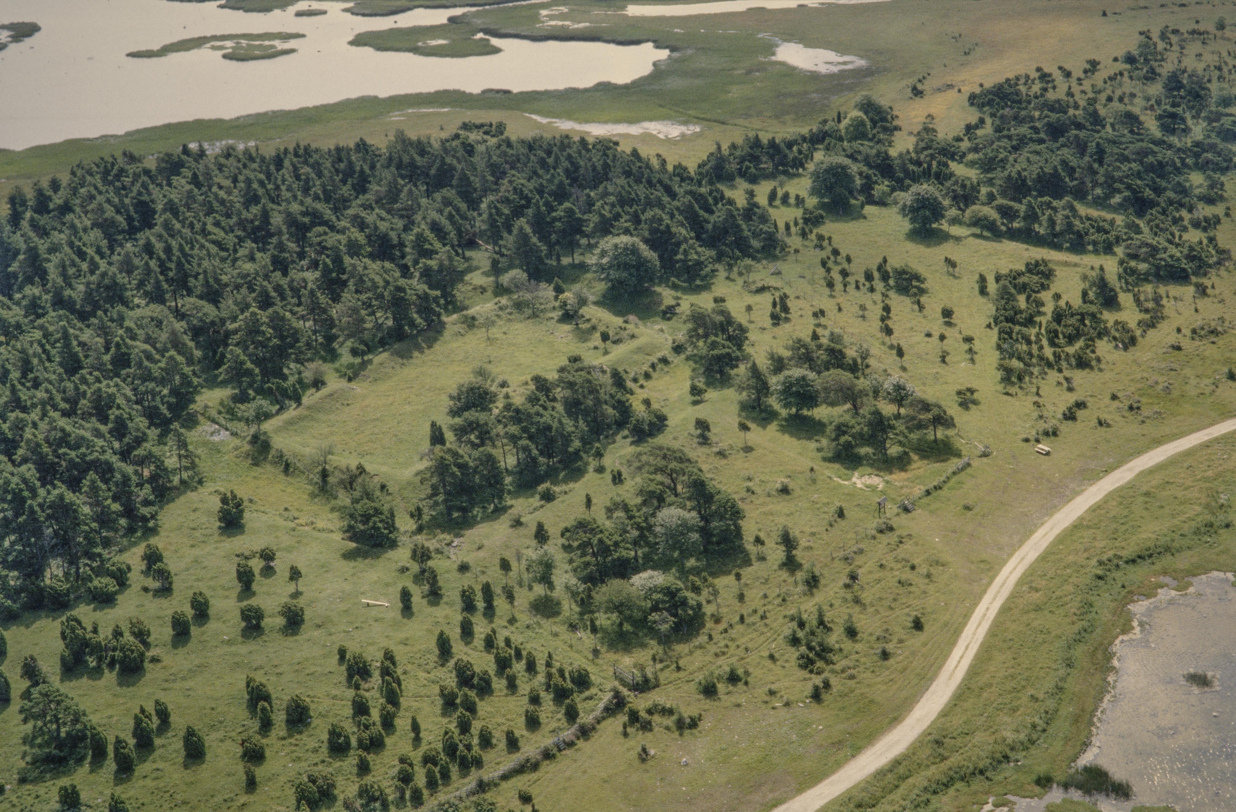 Beskrivning: Vivesholms befästningsområde RAÄnr Sanda 122:1-4 med lämningar efter borg, vallar, hamn m.m, Sandboviken uppe till vänster. Bilden är tagen mot (väderstreck): SSO