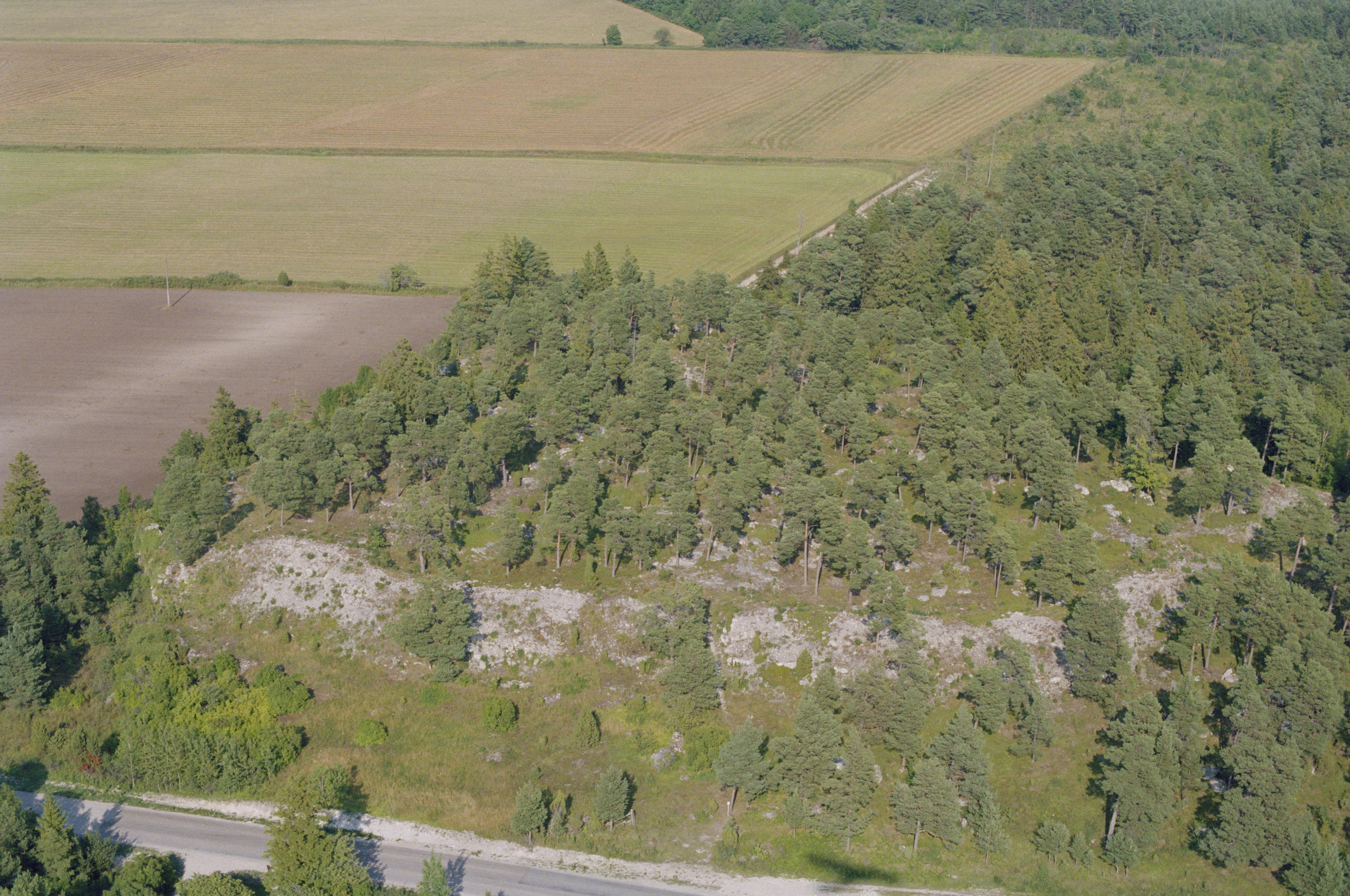 Beskrivning: Området Grausne, sydost om fiskeläget Lickershamn. Till höger om bildens mitt fornborg RAÄnr Stenkyrka 22:1 vid färdväg Stenkyrka 250 (i bildens nedre kant). Bilden är tagen mot (väderstreck): Ö