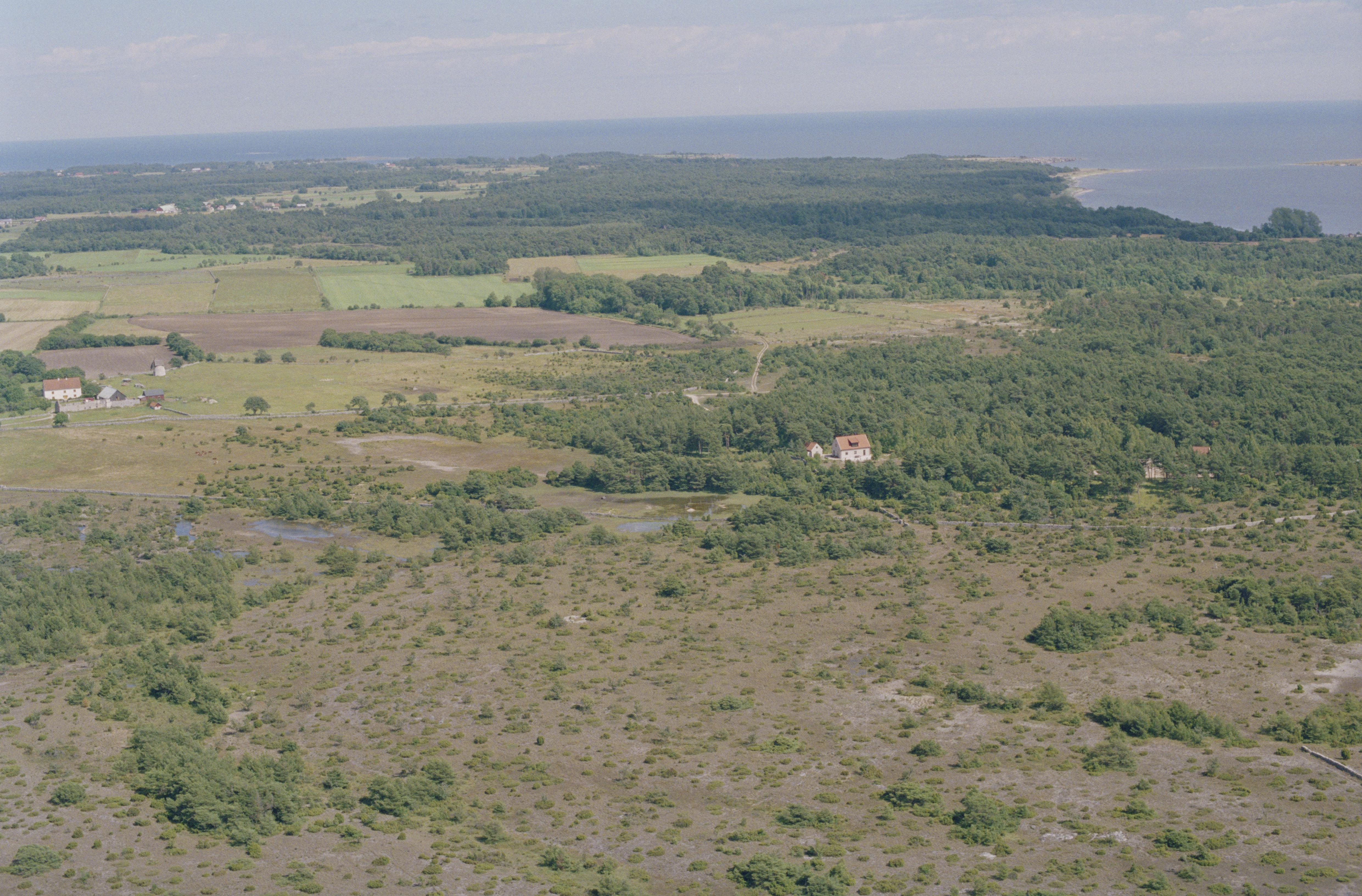 Beskrivning: Området mellan byarna Nore (i bildens nedre del) och Austre (i bildens övre del). Till vänster om bildens mitt Augstens gård med väderkvarn vid bytomt RAÄnr Vamlingbo 227 och 220. Bilden är tagen mot (väderstreck): Ö
