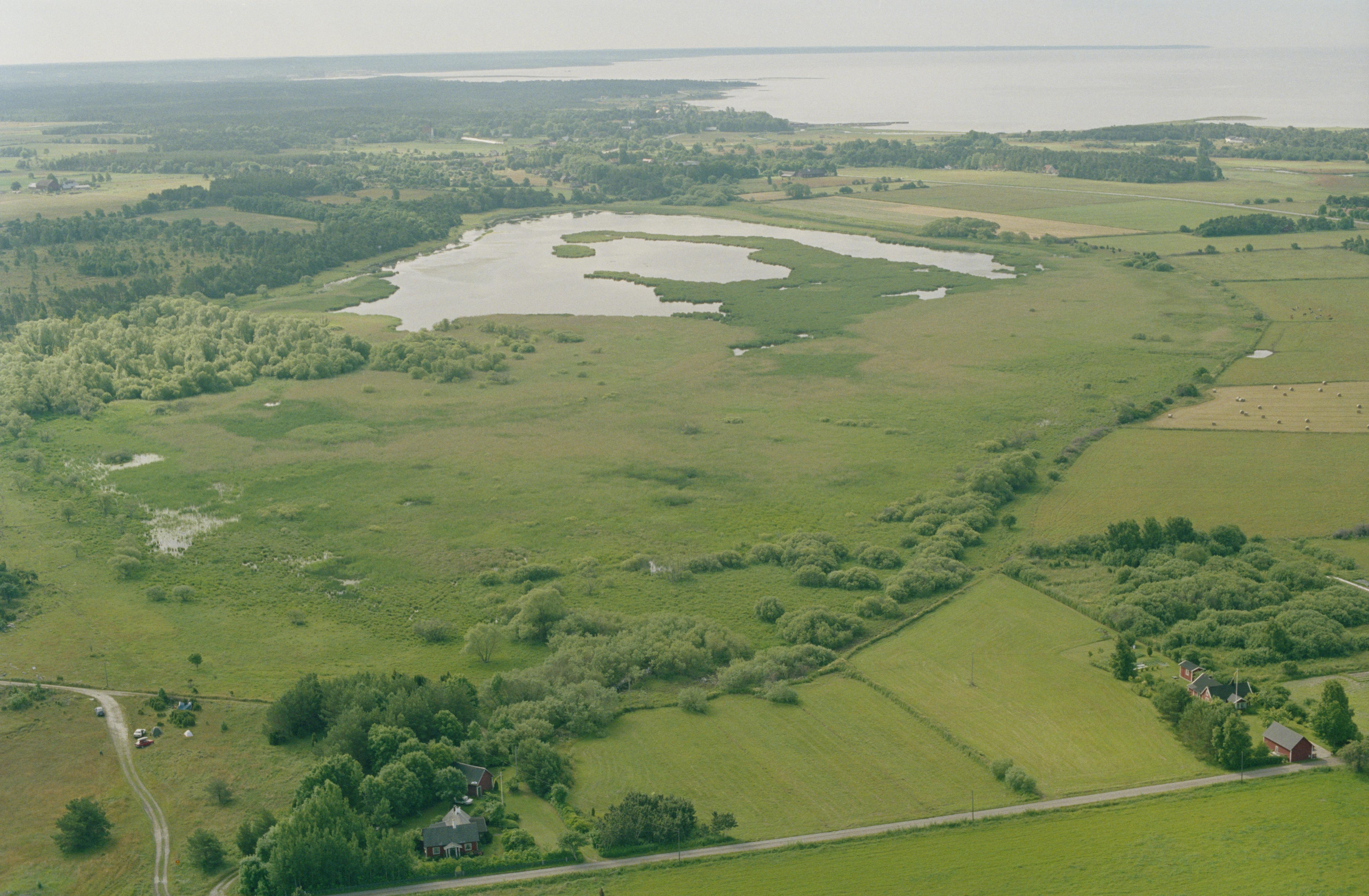 Beskrivning: Paviken, en vikingatida hamn- och handelsplats. I området bo- och gravplatser RAÄnr Västergarn 65:1 m.fl. I bildens övre del Västergarns kyrkby och Kronholmen. Bilden är tagen mot (väderstreck): S