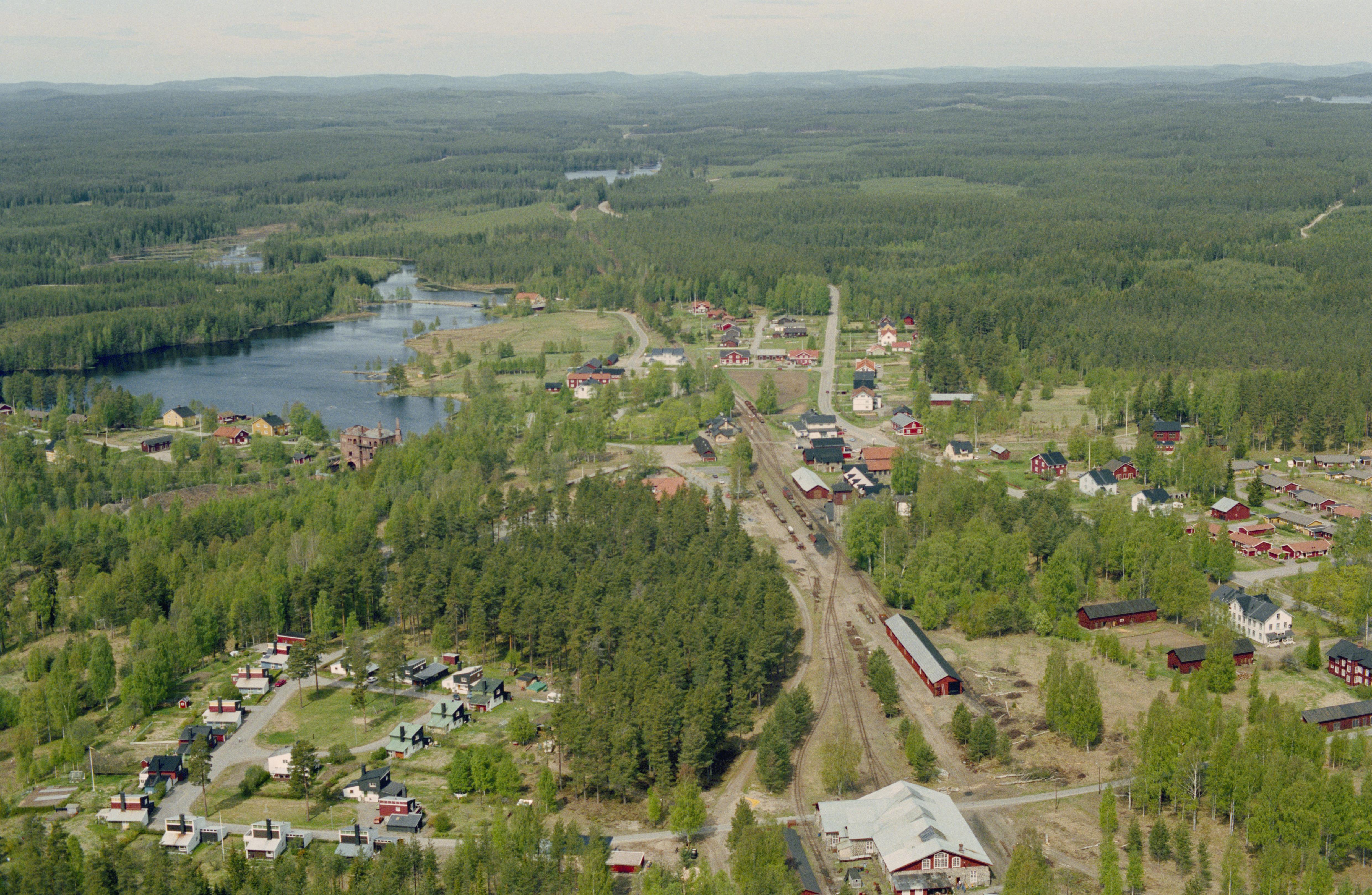 Beskrivning: Jädraås bruk vid Jädraån. Bruksherrgård, hytta, smedja, järnvägsstation m.m. Till vänster över bildens mitt ett område med fångstgropar RAÄnr Ockelbo 253:1, m.fl. Bilden är tagen mot (väderstreck): NV