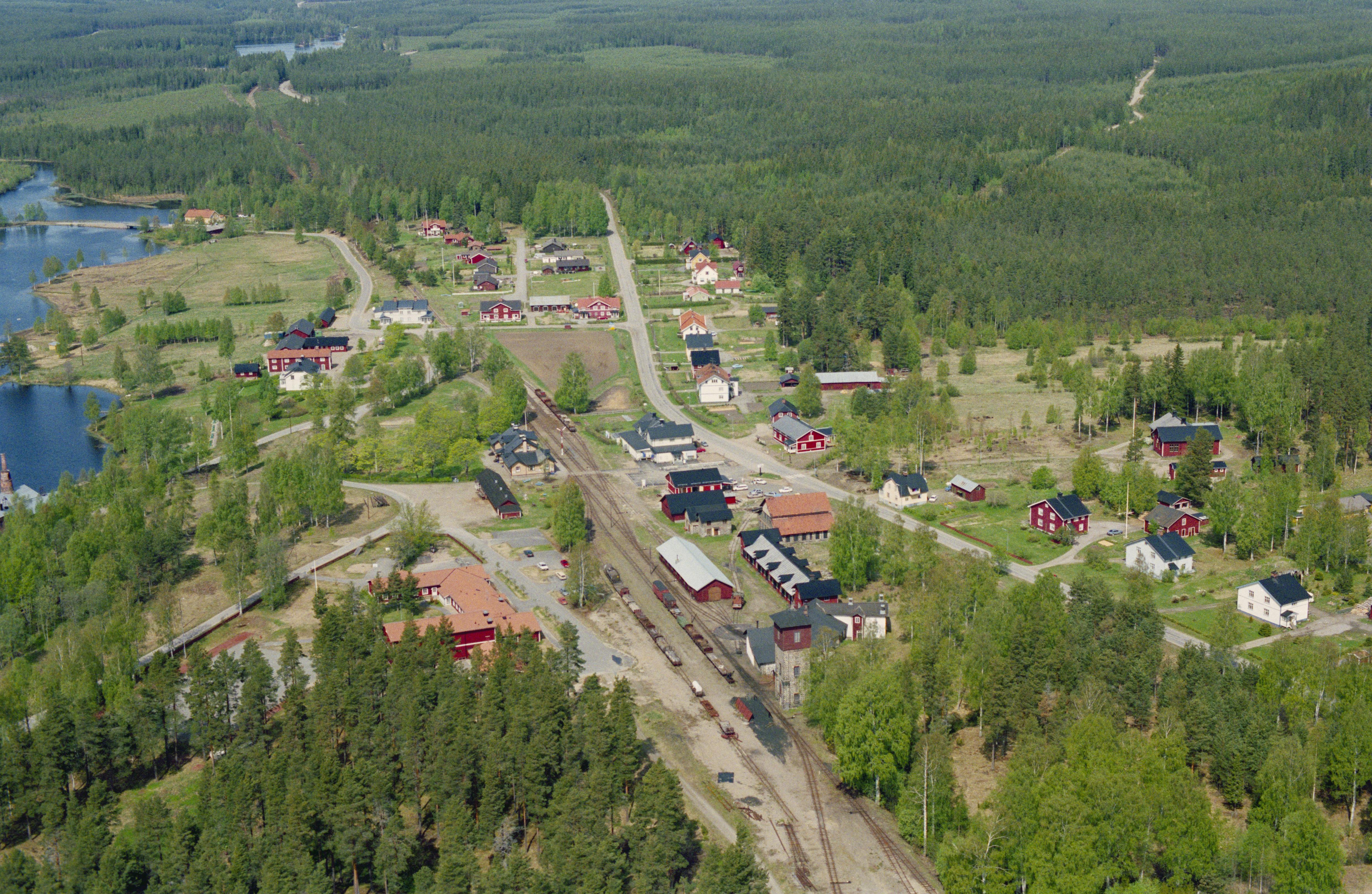 Beskrivning: Jädraås bruk vid Jädraån. Bruksherrgård, hytta, smedja, järnvägsstation (under bildens mitt) m.m. Jädraås herrgård till vänster om bildens mitt. Bilden är tagen mot (väderstreck): NV