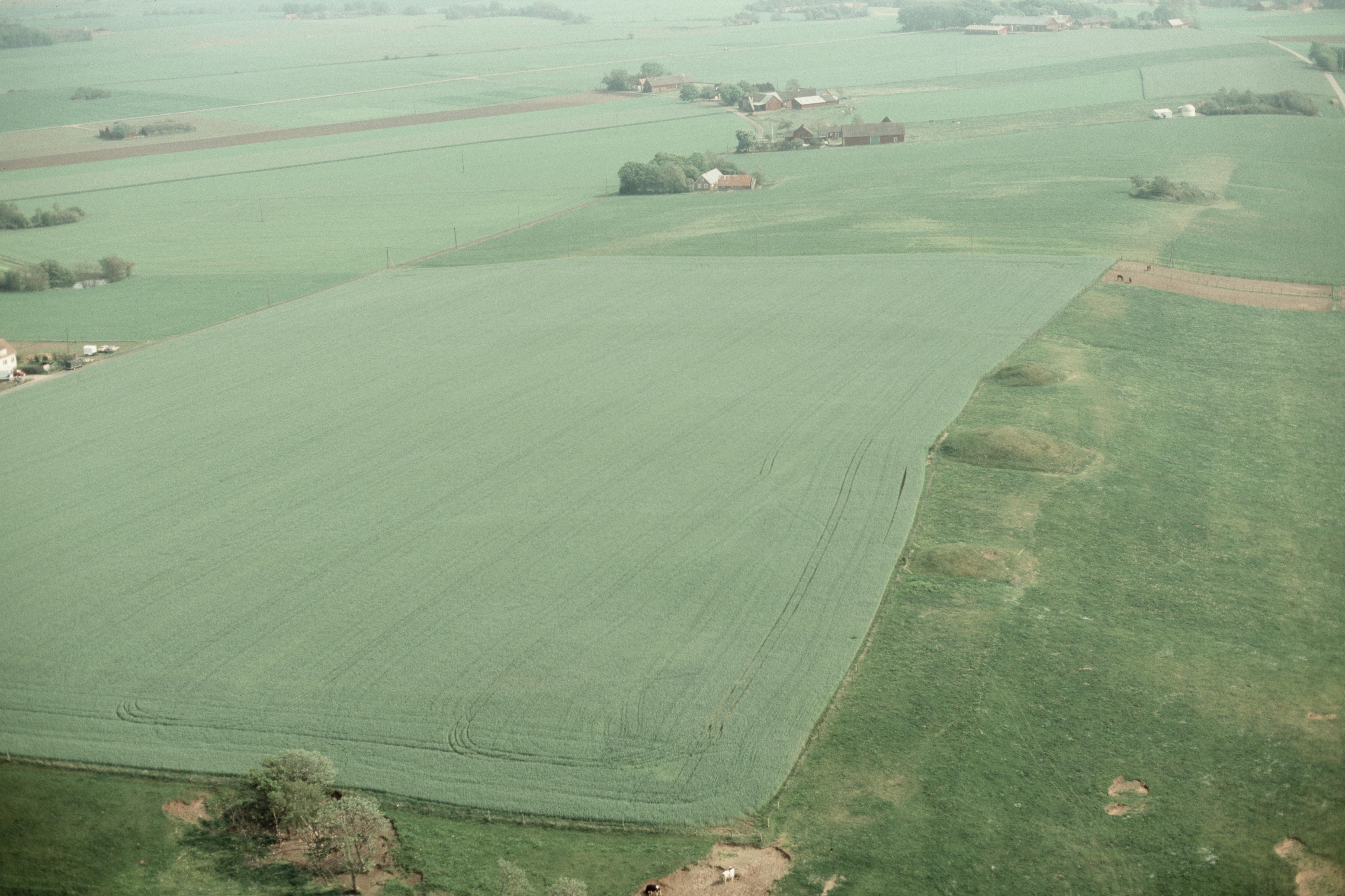 Beskrivning: Truedsgården. Gravhögar RAÄnr Eldsberga 2:1, 3:1, 4:1 m.fl. till höger om bildens mitt. Bilden är tagen mot (väderstreck): S