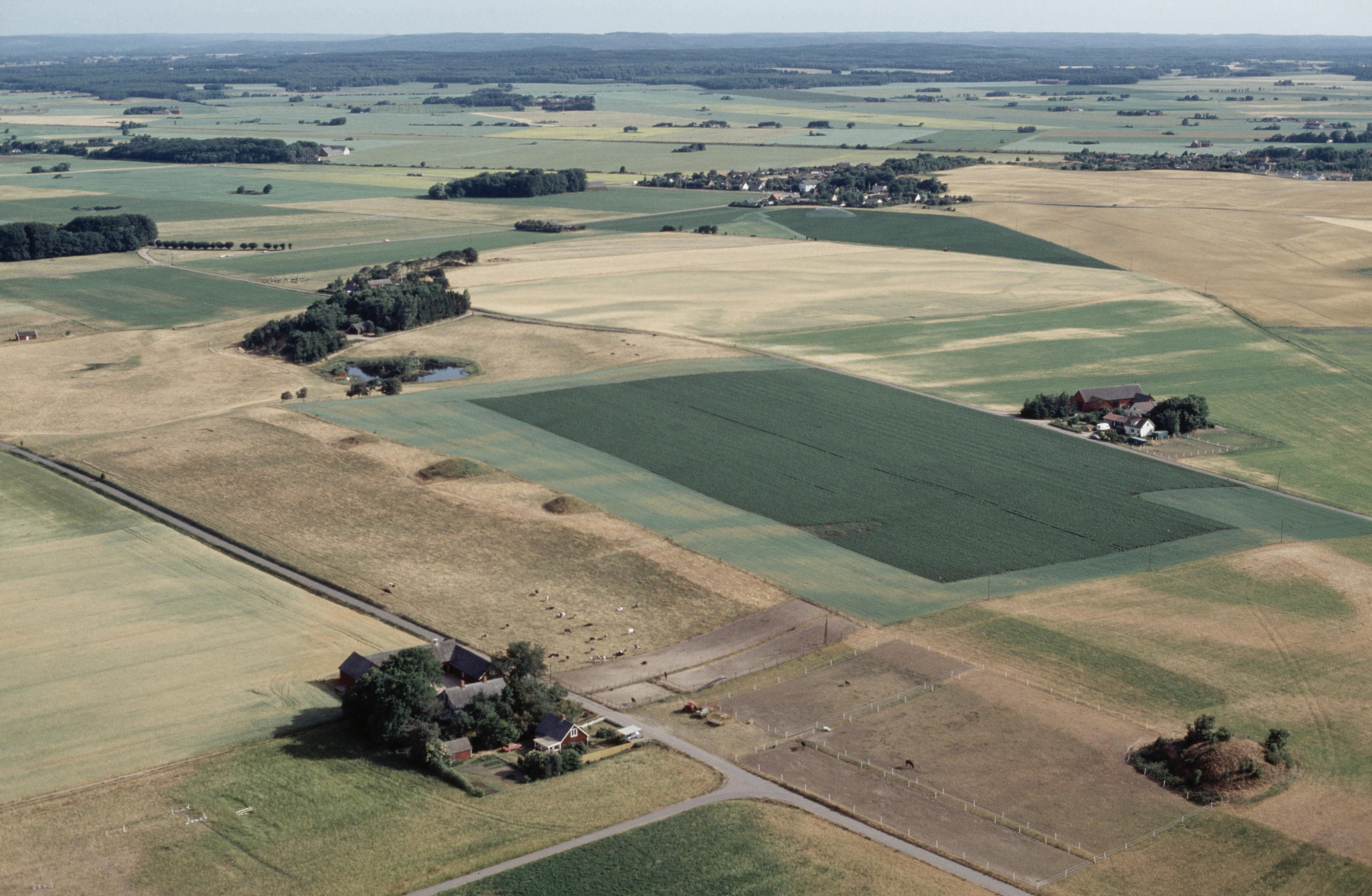 Beskrivning: Truedsgården. Gravhögar RAÄnr Eldsberga 2:1, 3:1, 4:1 m.fl. till vänster om bildens mitt. Bilden är tagen mot (väderstreck): NNV