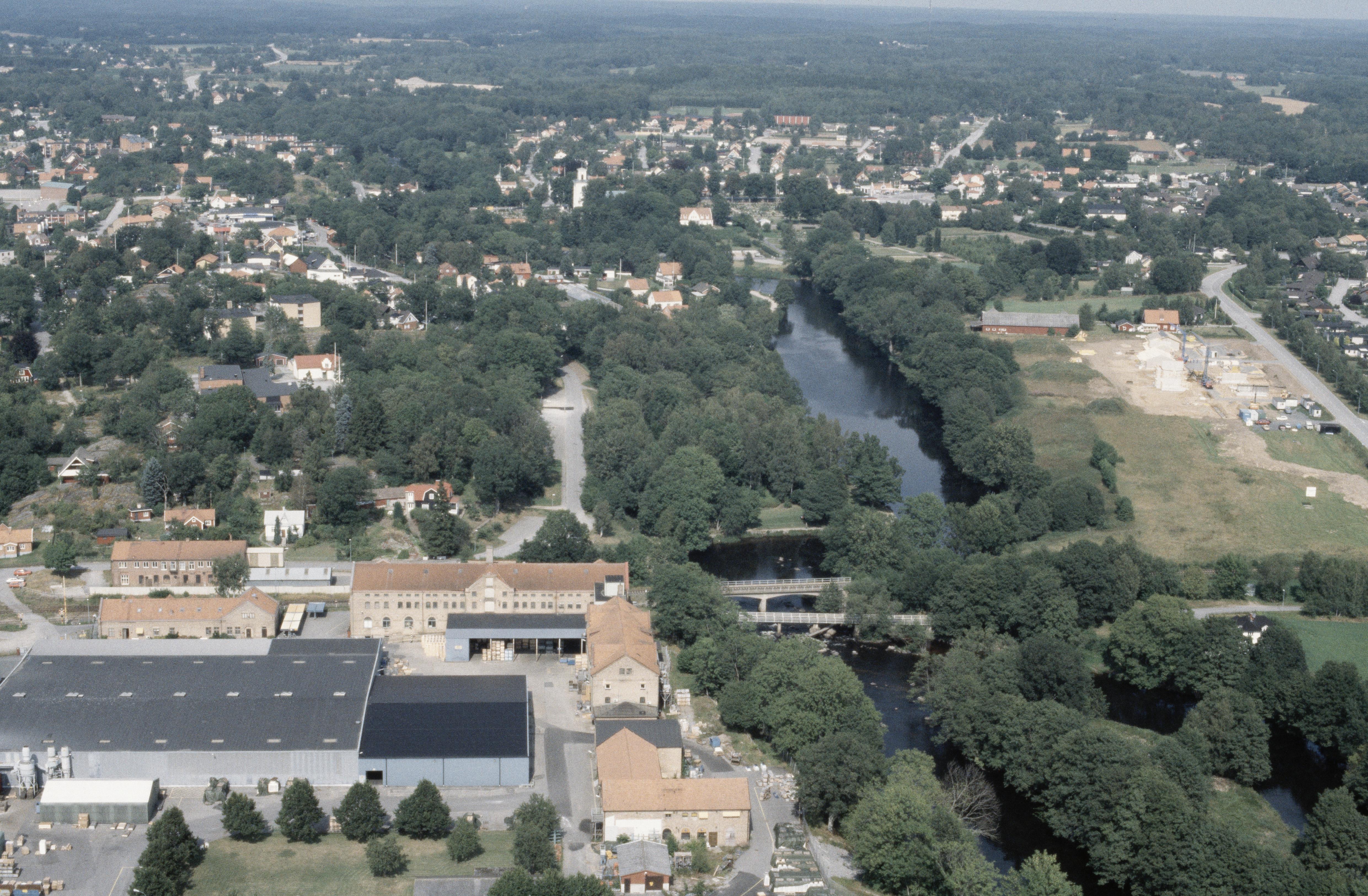 Tätorten Mörrum vid Mörrumsån. Mörrums kyrka i bildens övre del. Bilden är tagen mot (väderstreck): NNO