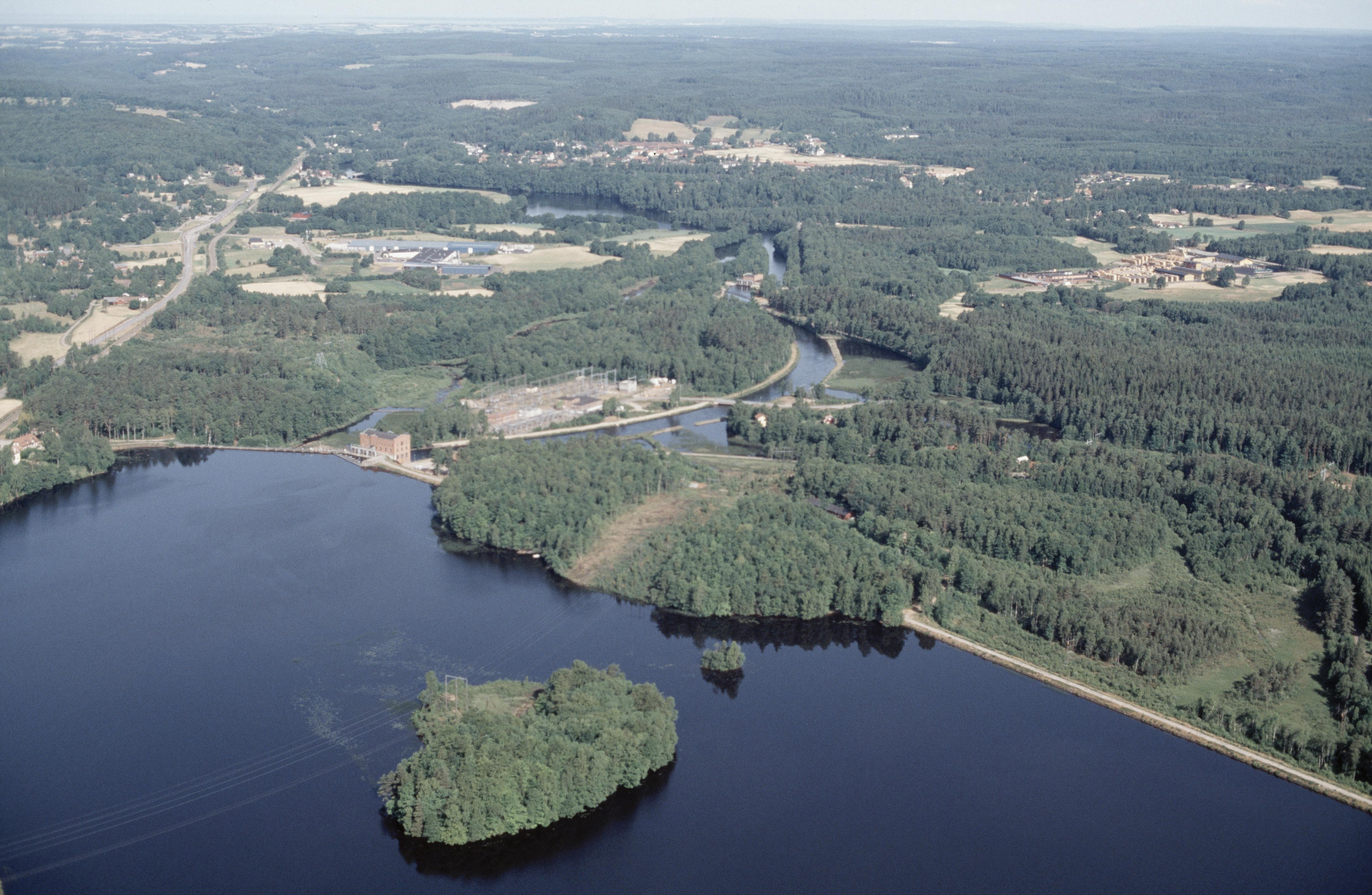 Beskrivning: Ån Lagan sydost om Knäreds tätort. Runt bildens mitt Knäreds kraftverk i Lagadalen. Bilden är tagen mot (väderstreck): VNV