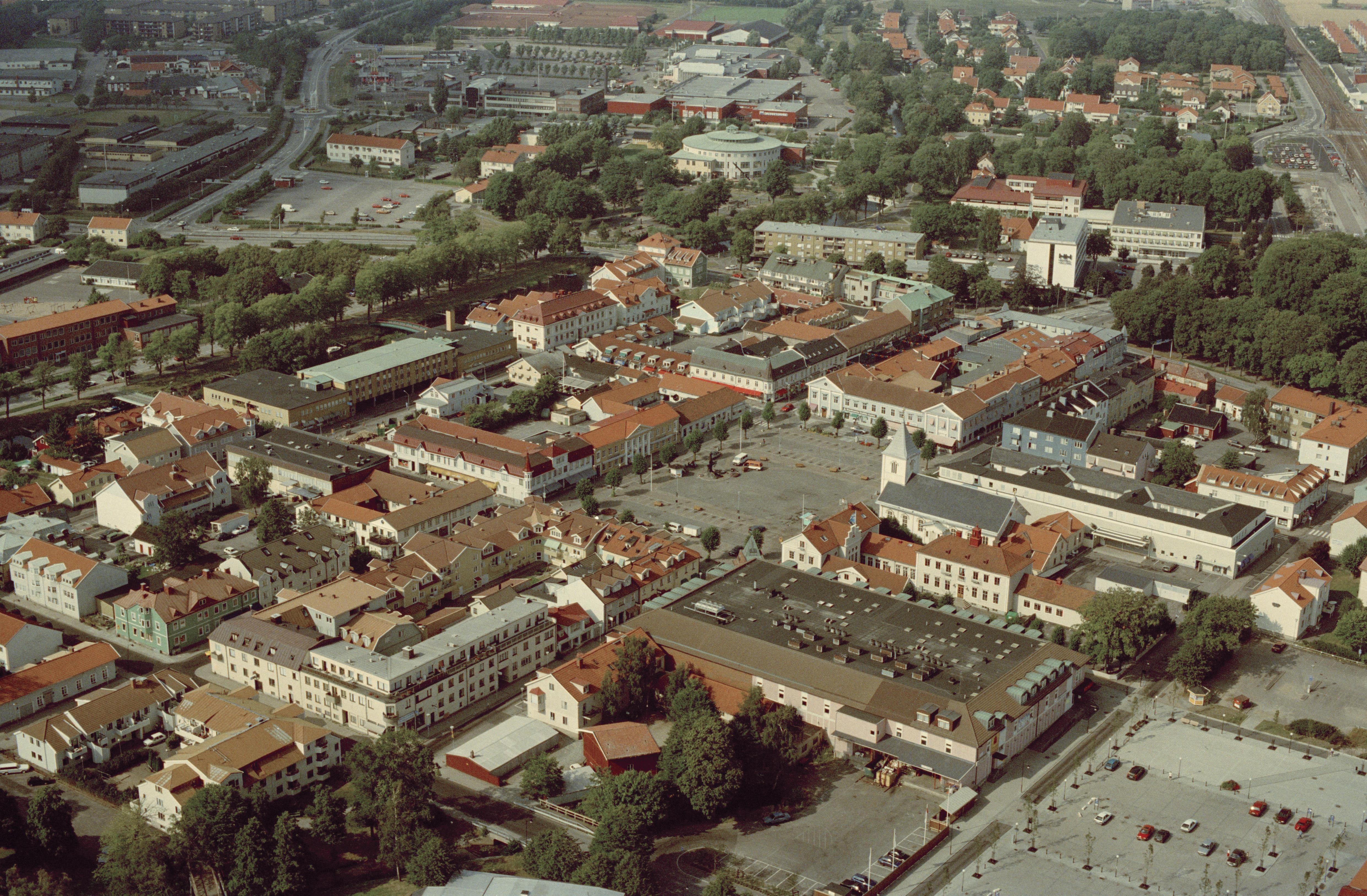 Beskrivning: Kungsbacka stad och Kungsbackaån. Kungsbacka kyrka till höger om bildens mitt. Bilden är tagen mot (väderstreck): N