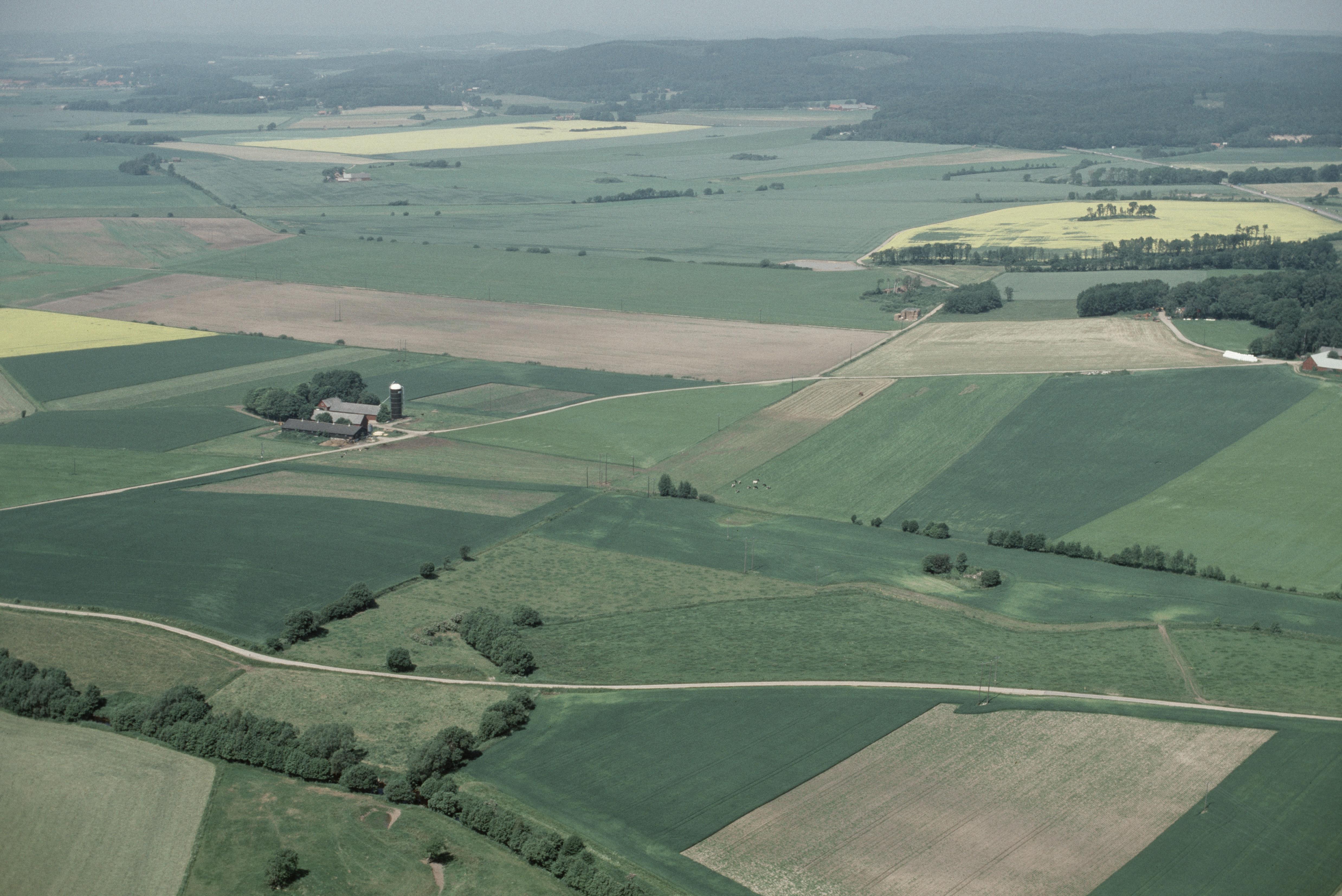Beskrivning: Suseån vid gårdarna Stallberg (till vänster) och Gårdstorp väster om Kvibille. Innan bygge av väg E6 mellan Laholm och Slöinge. Bilden är tagen mot (väderstreck): N