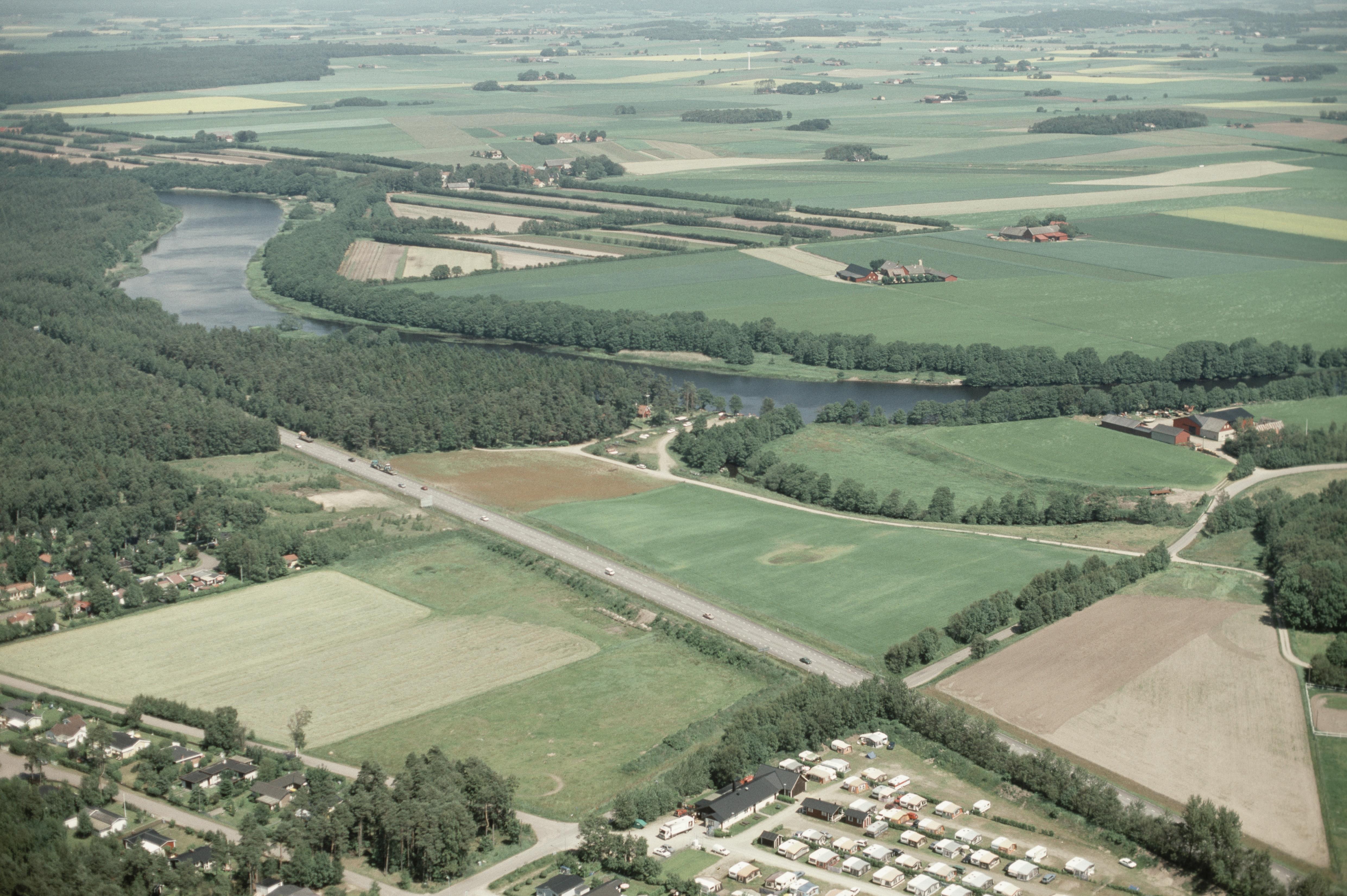 Beskrivning: Väg E6 och ån Lagan vid Restad. Bilden är tagen mot (väderstreck): NO