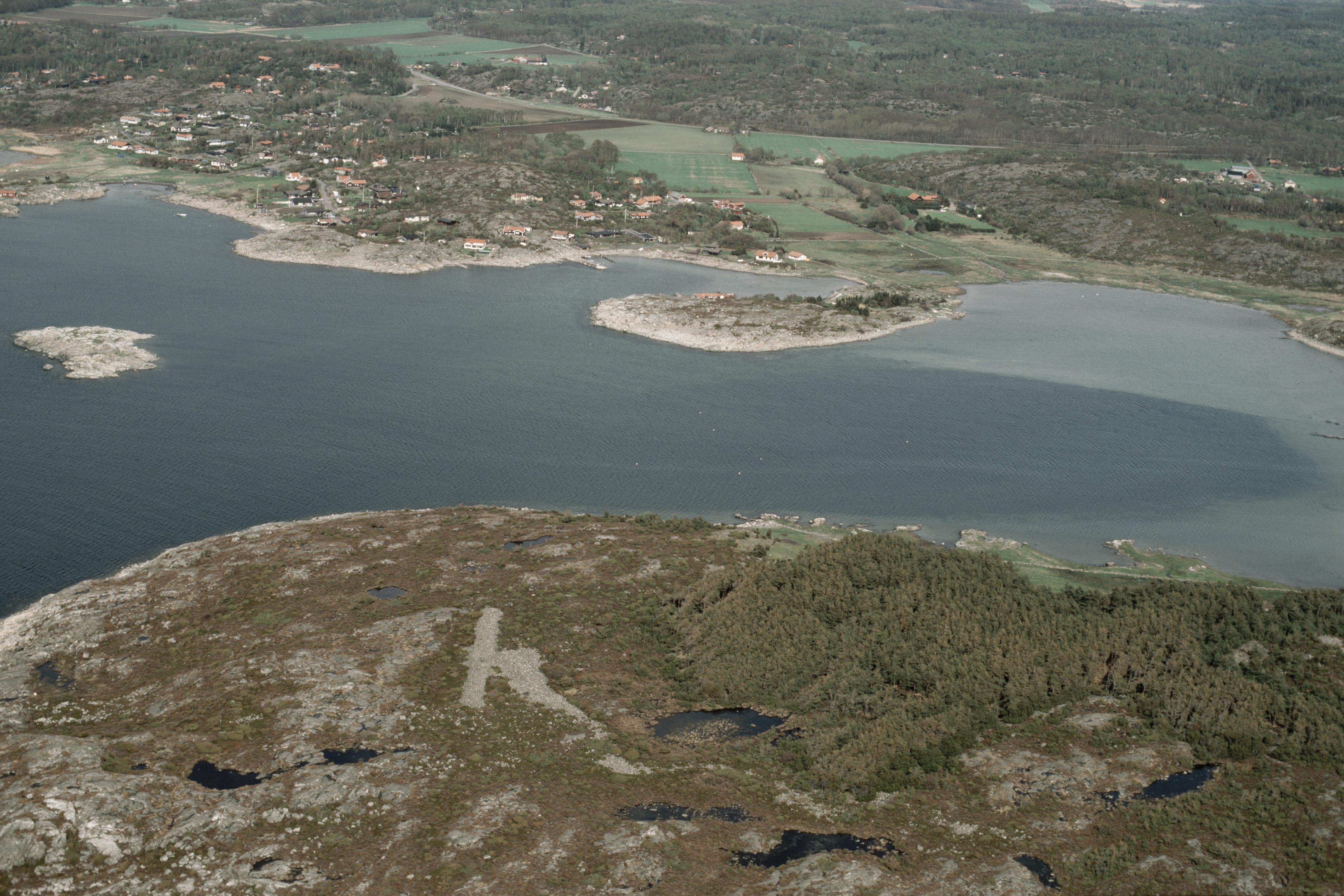 Beskrivning: Norra delen av Onsala Sandö. Röse RAÄnr Onsala 82:1 i bildens nedre del. I bildens övre del udden Hagaholm och orten Västra Hagen. Bilden är tagen mot (väderstreck): NO