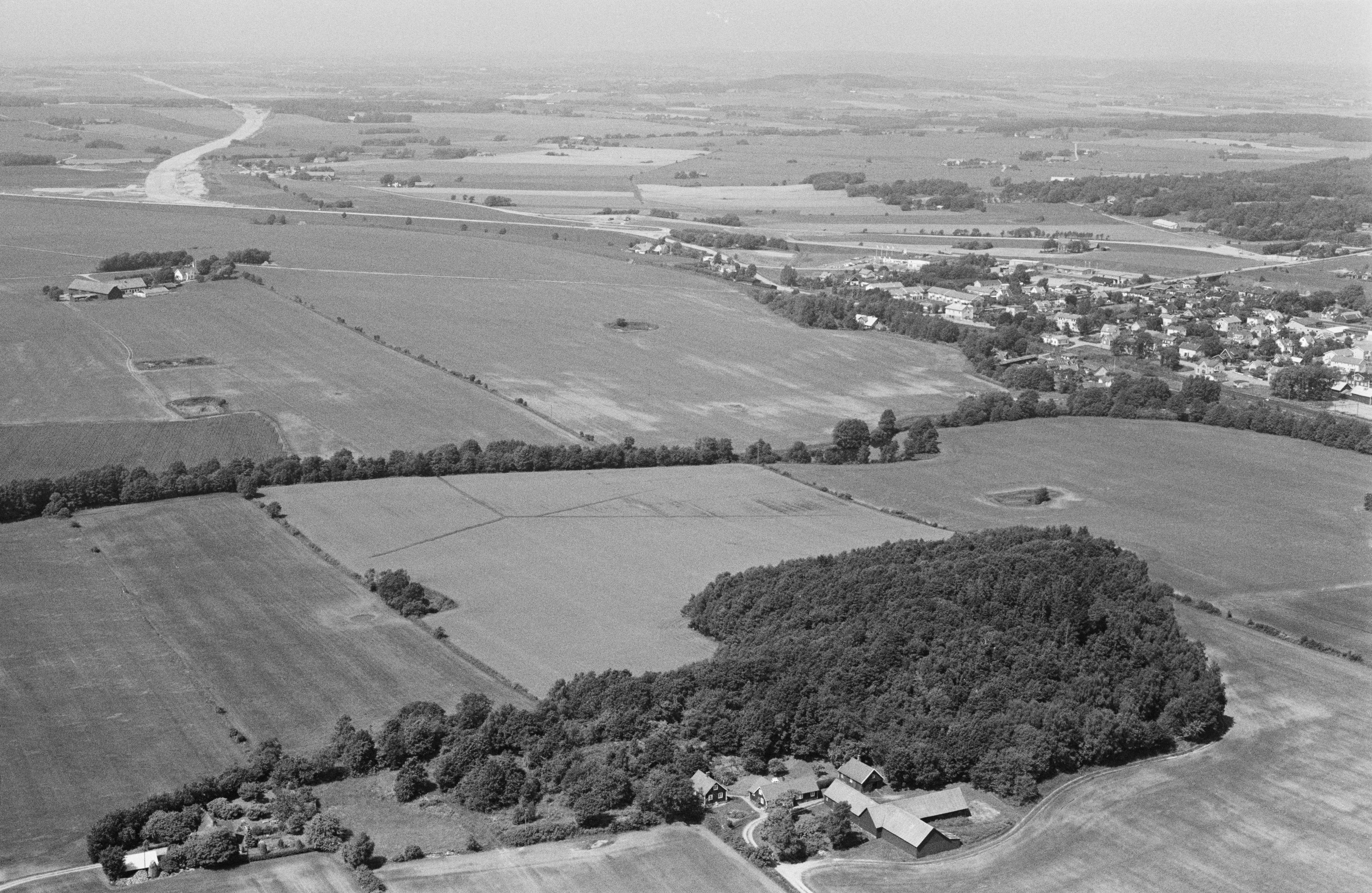 Beskrivning: Vid gränsen mellan socknen Eftra, Skrea (uppe till vänster) och Årstad (uppe till höger). Väg E6 byggs vid området Broen, söder om Heberg. Bilden är tagen mot (väderstreck): NV