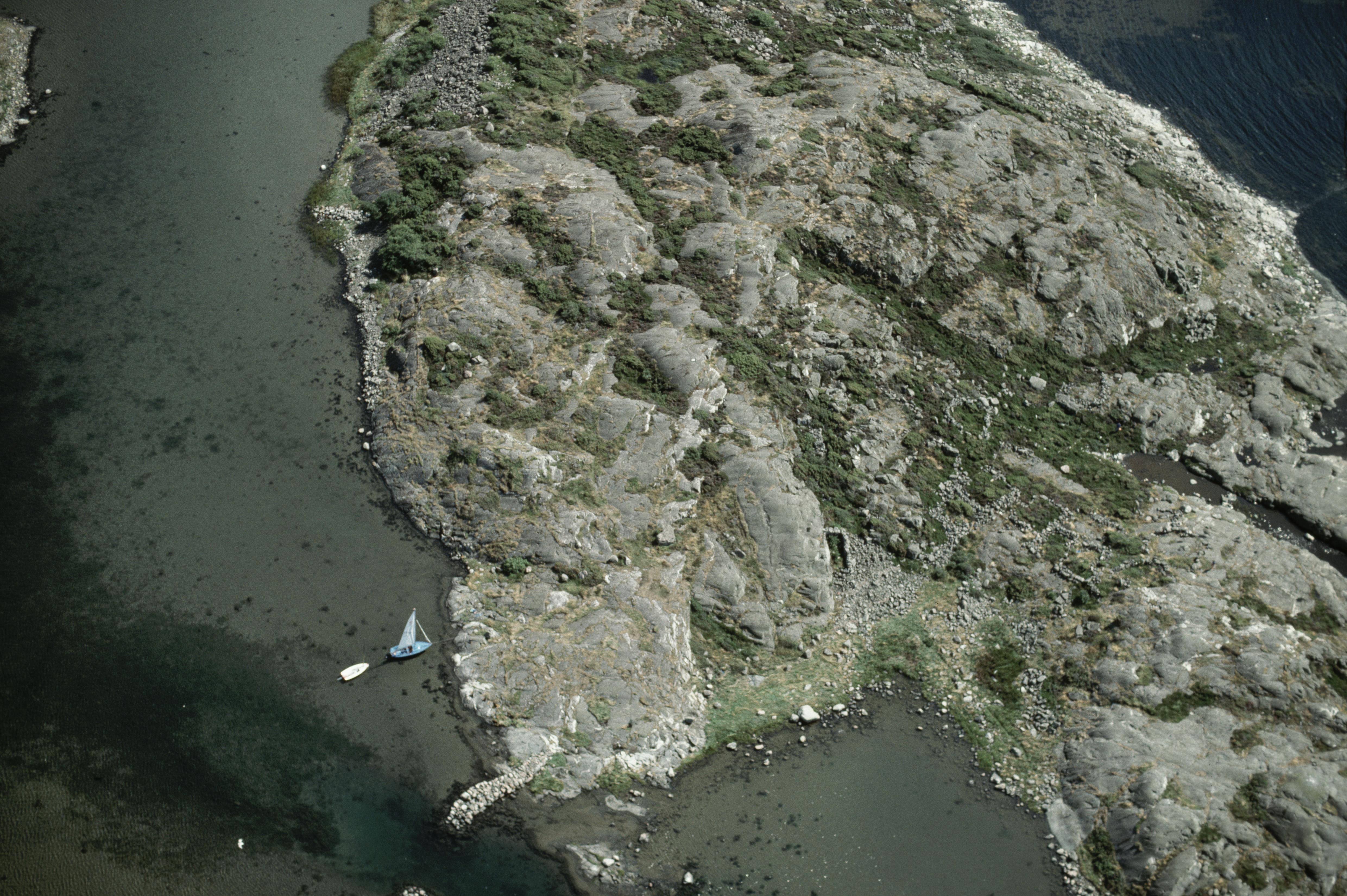 Beskrivning: Tomtningar och fiskelägeslämningar på udden vid Vinbärsholmen. Fiskeläge RAÄnr Vallda 59:1. Bilden är tagen mot (väderstreck): SO