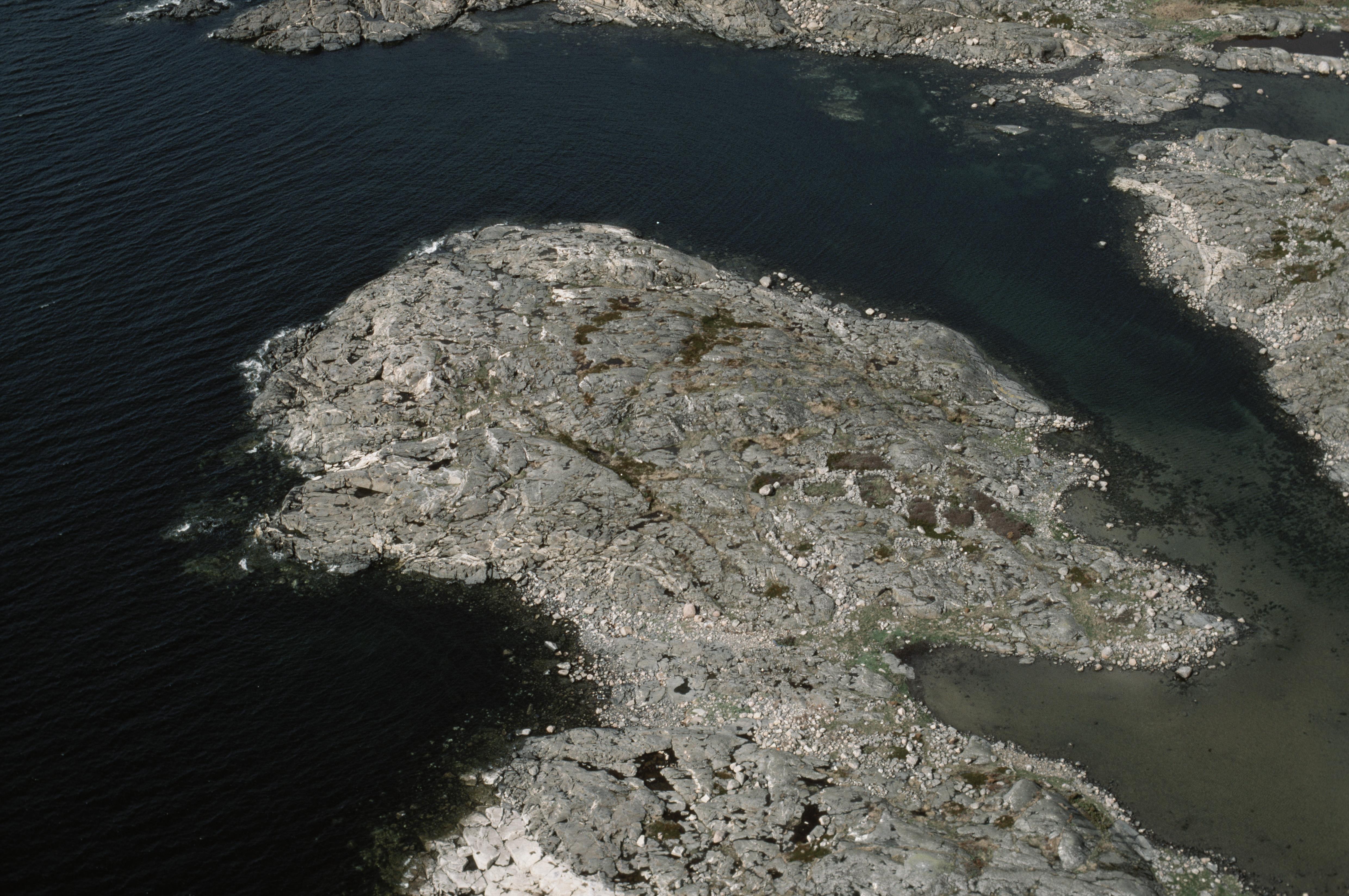 Beskrivning: Tomtningar och fiskelägeslämningar på udden vid Vinbärsholmen (uppe till höger). Fiskeläge RAÄnr Vallda 61:1 vid bildens mitt. Bilden är tagen mot (väderstreck): N