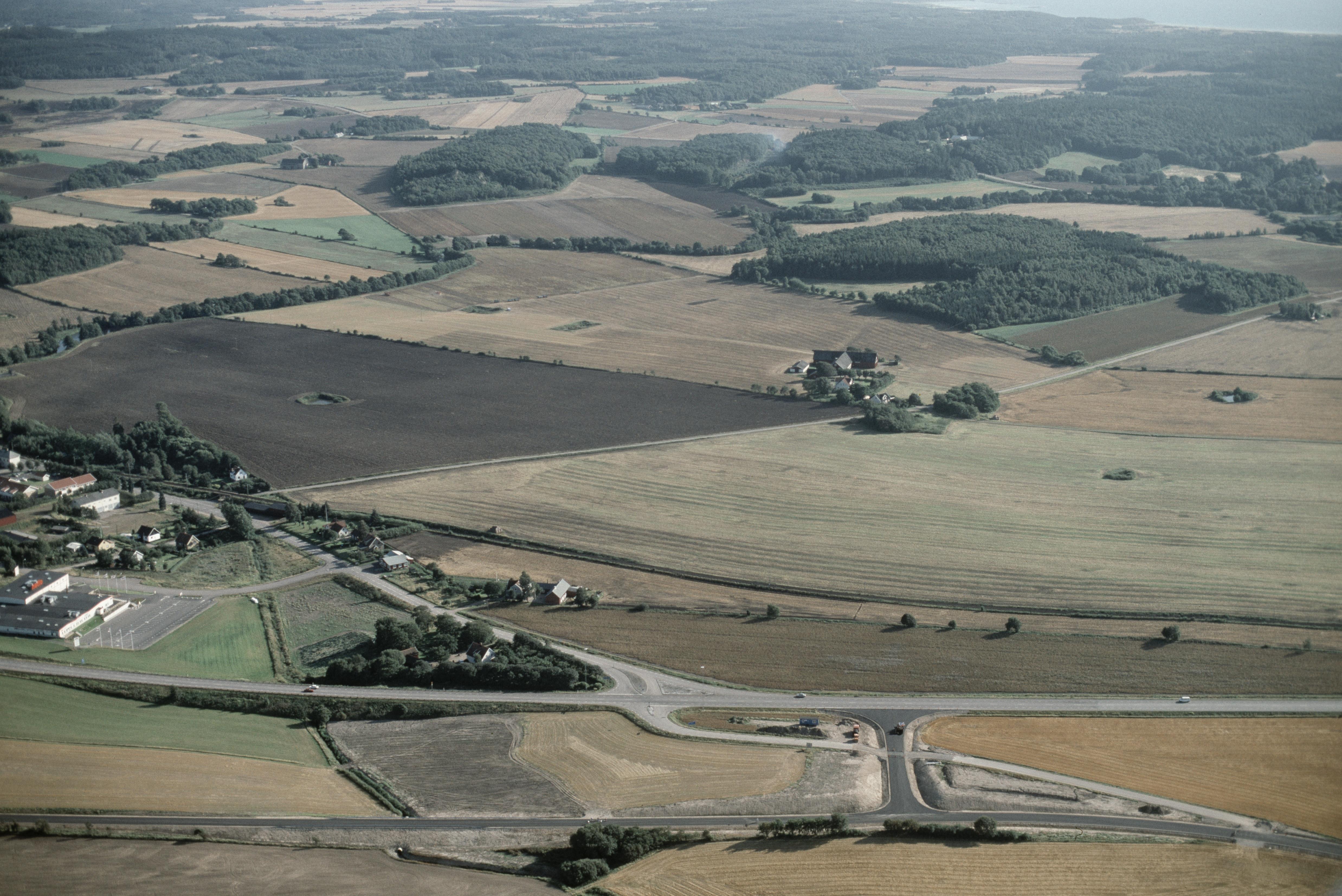 Beskrivning: Vid gränsen mellan socknen Årstad, Eftra, (uppe till vänster) och Skrea (uppe till höger). Väg E6 byggs vid området Broen, söder om Heberg. Bilden är tagen mot (väderstreck): S