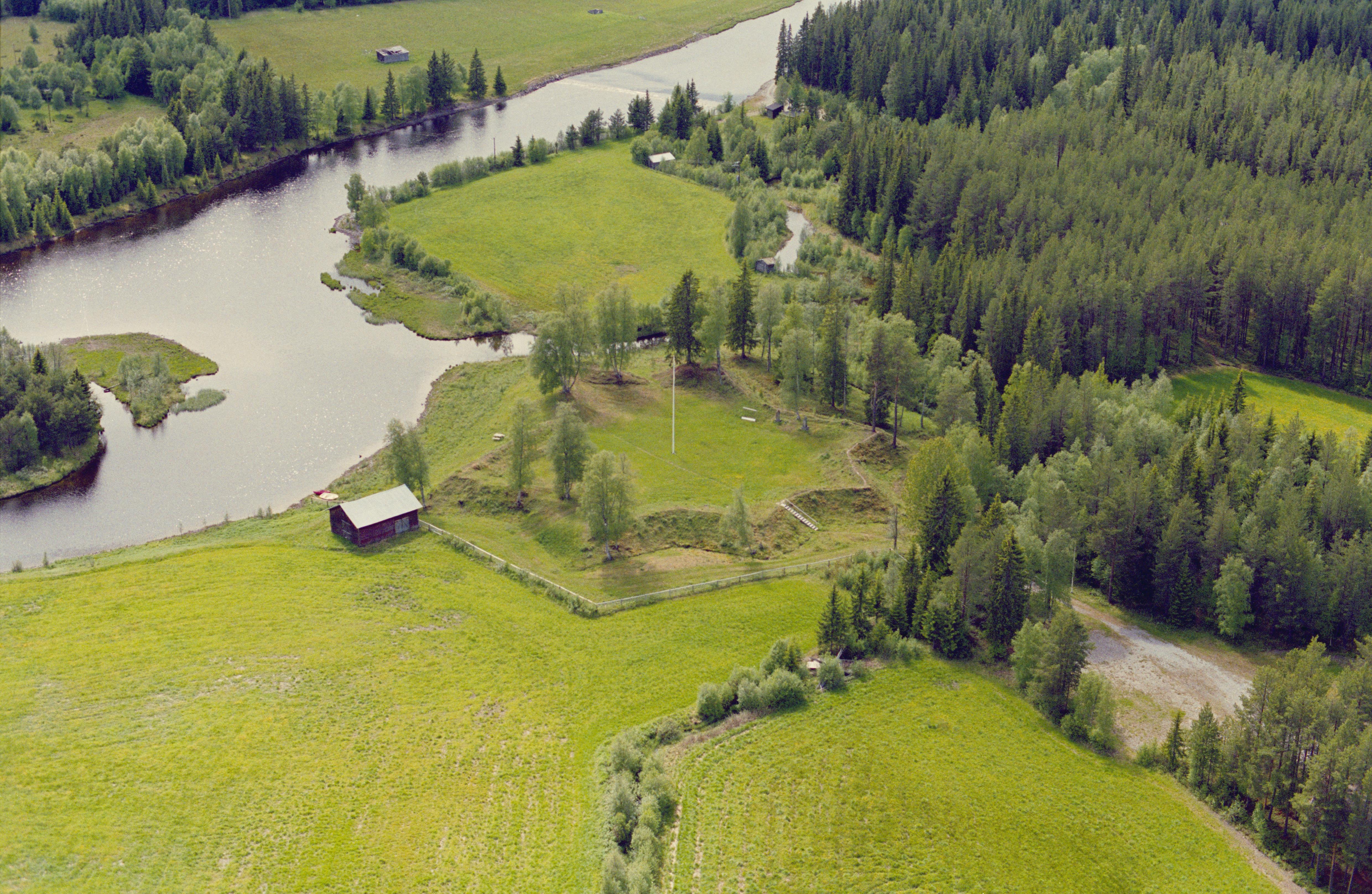 Beskrivning: Älven Ljusnan nordväst i Långå by. Vid bildens mitt Långå skans med minnesmärke RAÄnr Hede 6:1-3. Bilden är tagen mot (väderstreck): SV