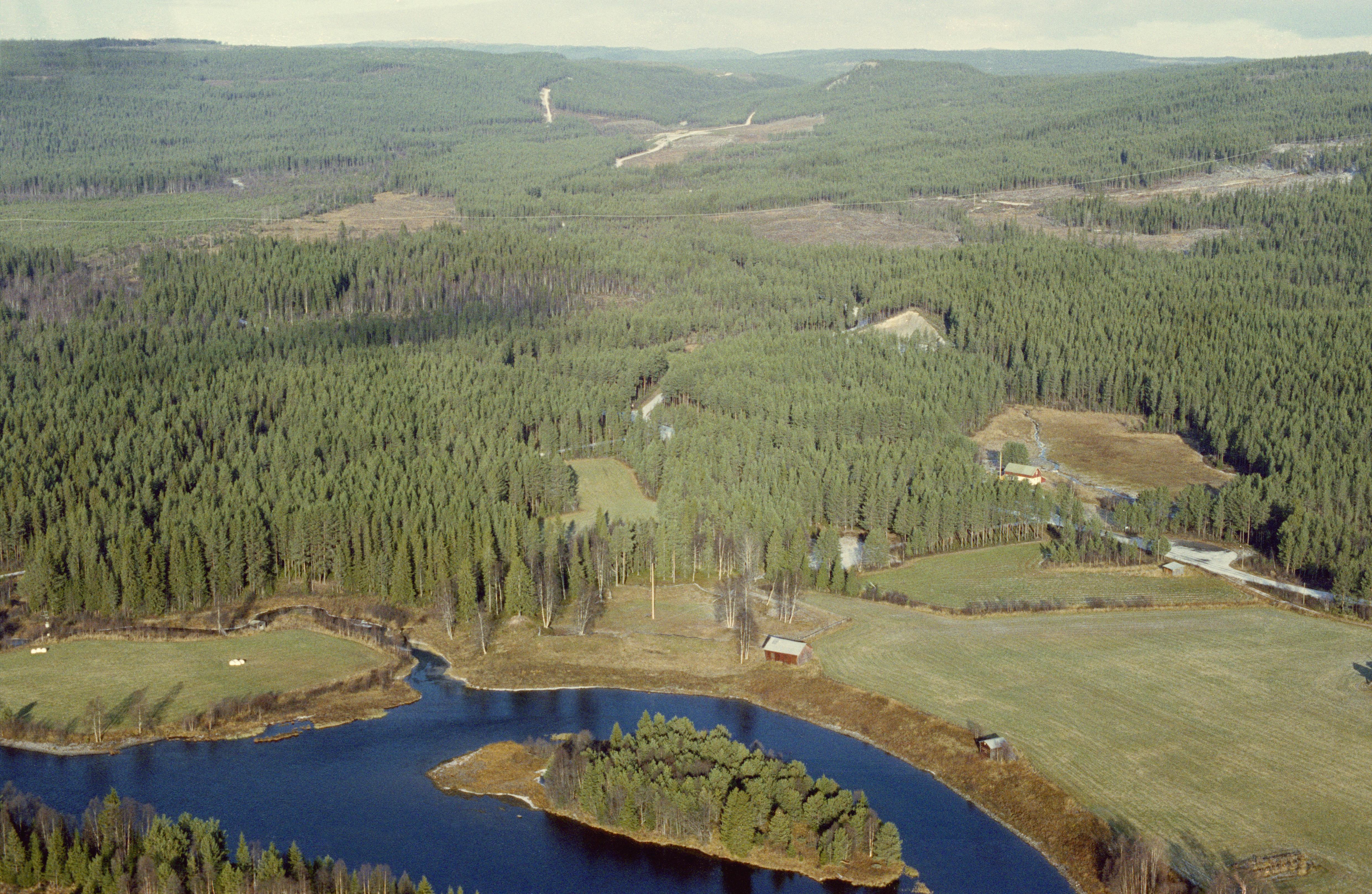 Beskrivning: Älven Ljusnan nordväst i Långå by. Vid bildens mitt Långå skans med minnesmärke RAÄnr Hede 6:1-3. Bilden är tagen mot (väderstreck): N