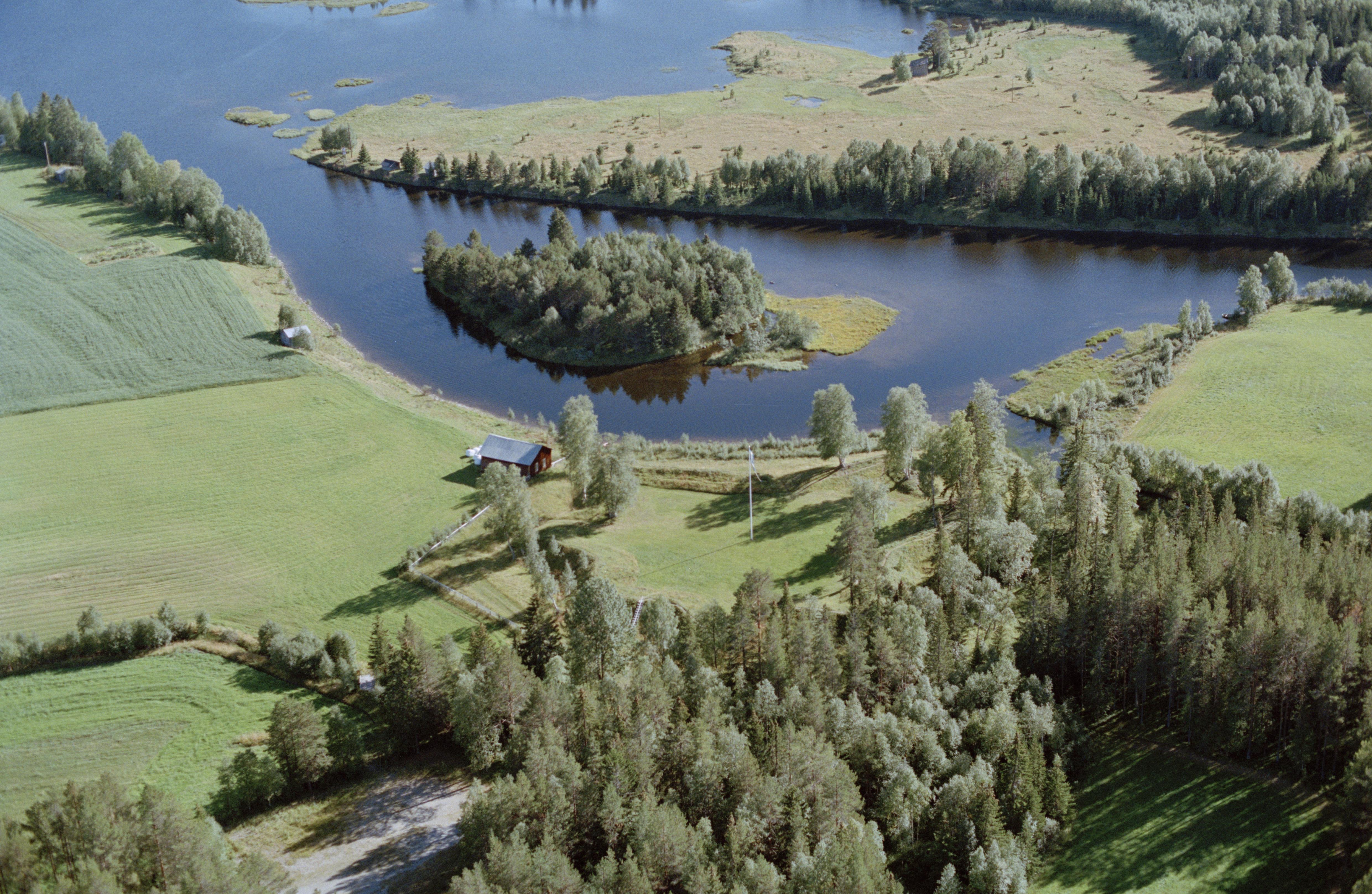 Beskrivning: Älven Ljusnan nordväst i Långå by. Vid bildens mitt Långå skans med minnesmärke RAÄnr Hede 6:1-3. Bilden är tagen mot (väderstreck): SSO