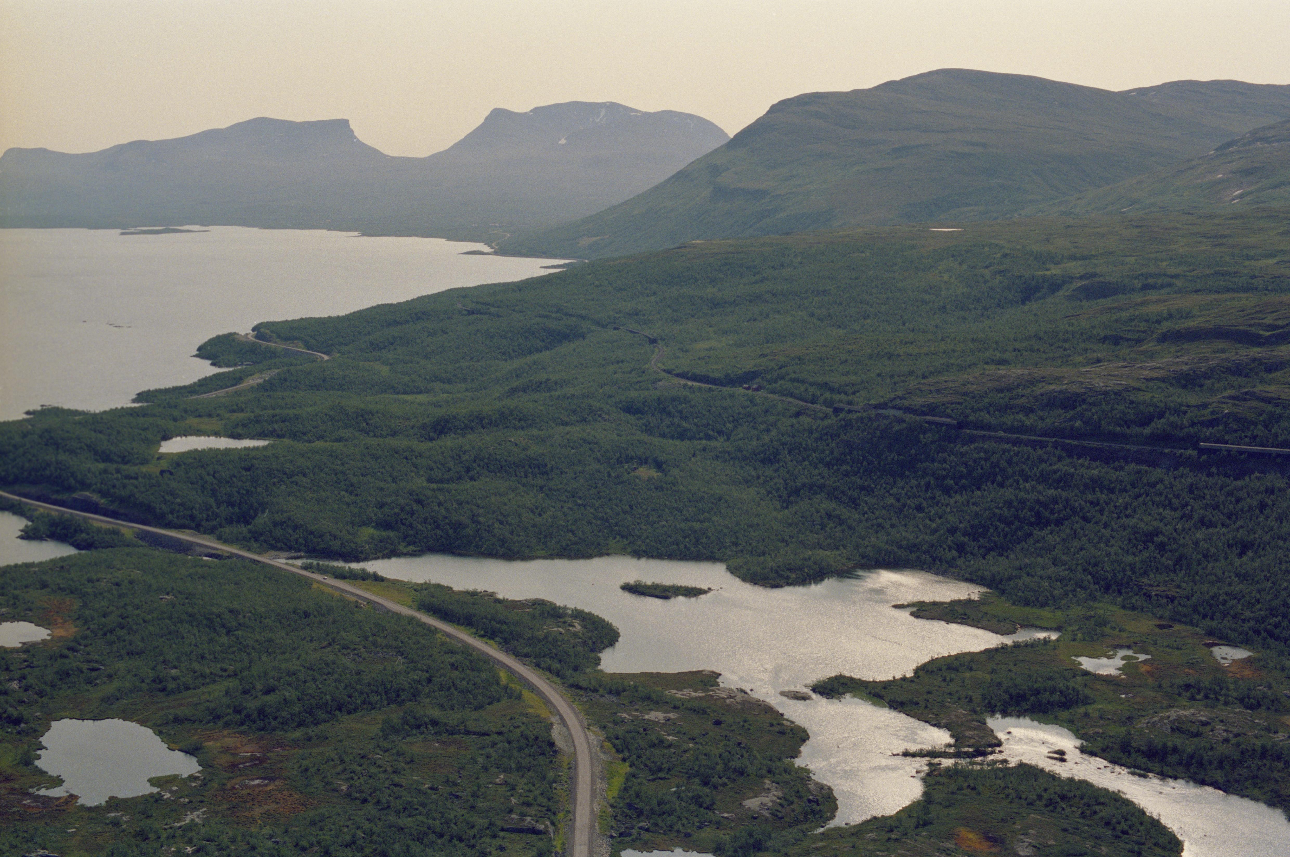 Beskrivning: Anmärkning (övrig): Riksintresse-nr/namn: BD36 - Torneträskområdet - Ofotenbanan. Socken: Jukkasjärvi. Motivering: Järnvägsmiljö längs med Ofotenbanan, som är en viktig del i länets industri- och teknikhistoria och landets första, längre elektrifierade bana. Ofotenbanan förde med sig att gruvnäringen fick ett uppsving och att turismen kunde utvecklas i området. - Uttryck för riksintresset: Malmbanan och de lämningar som arbetet med denna gett upphov till; stationsbyggnader, materielväg, grunder och kyrkogård efter anläggarsamhällena vid Tornehamn och Katterjåkk, några äldre hus, grunder efter lokstall, hus, hotell och pumpstation bl a vid Riksgränsen. - I området ingår även: Sjangeli, koppargruva från 1600-talet och Kuokkel, koppargruva från slutet av 1800-talet. [Texten uppdaterat av Riksantikvarieämbetet våren 2013.] Beskrivning: Tornehamns by vid sjön Torneträsk (Duortnosjávri). Järnvägen Ofotbanen (Ofotbanan / Malmbanan) och Rallarkyrkogården / Tornehamns kyrkogård uppe till höger. I skogen till vänster om bildens mitt Tornehamns kapell vid bytomt RAÄnr Jukkasjärvi 186:1. Fjällområdet Lapporten uppe till vänster. Bilden är tagen mot (väderstreck): ONO Fotosyfte: Flygbildsdokumentation
