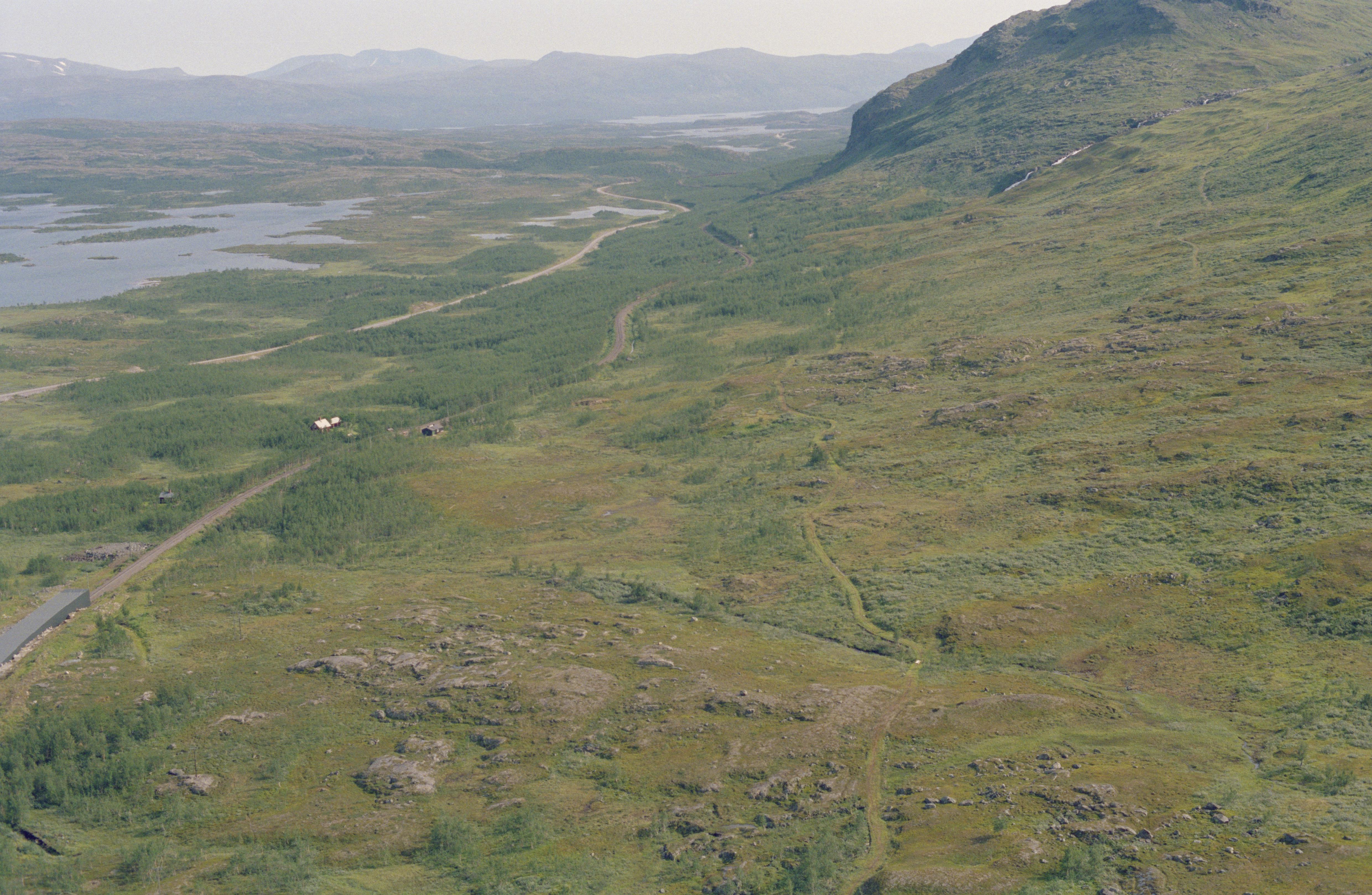 Beskrivning: Till vänster väg E10 och järnvägen Ofotbanen (Ofotbanan / Malmbanan) i området öster om Vassijaure (Vássijávri) järnvägsstation. I bildens mitt och nedre del färdvägen "Materialvägen" RAÄnr Jukkasjärvi 2701 och 2702. Bilden är tagen mot (väderstreck): Ö