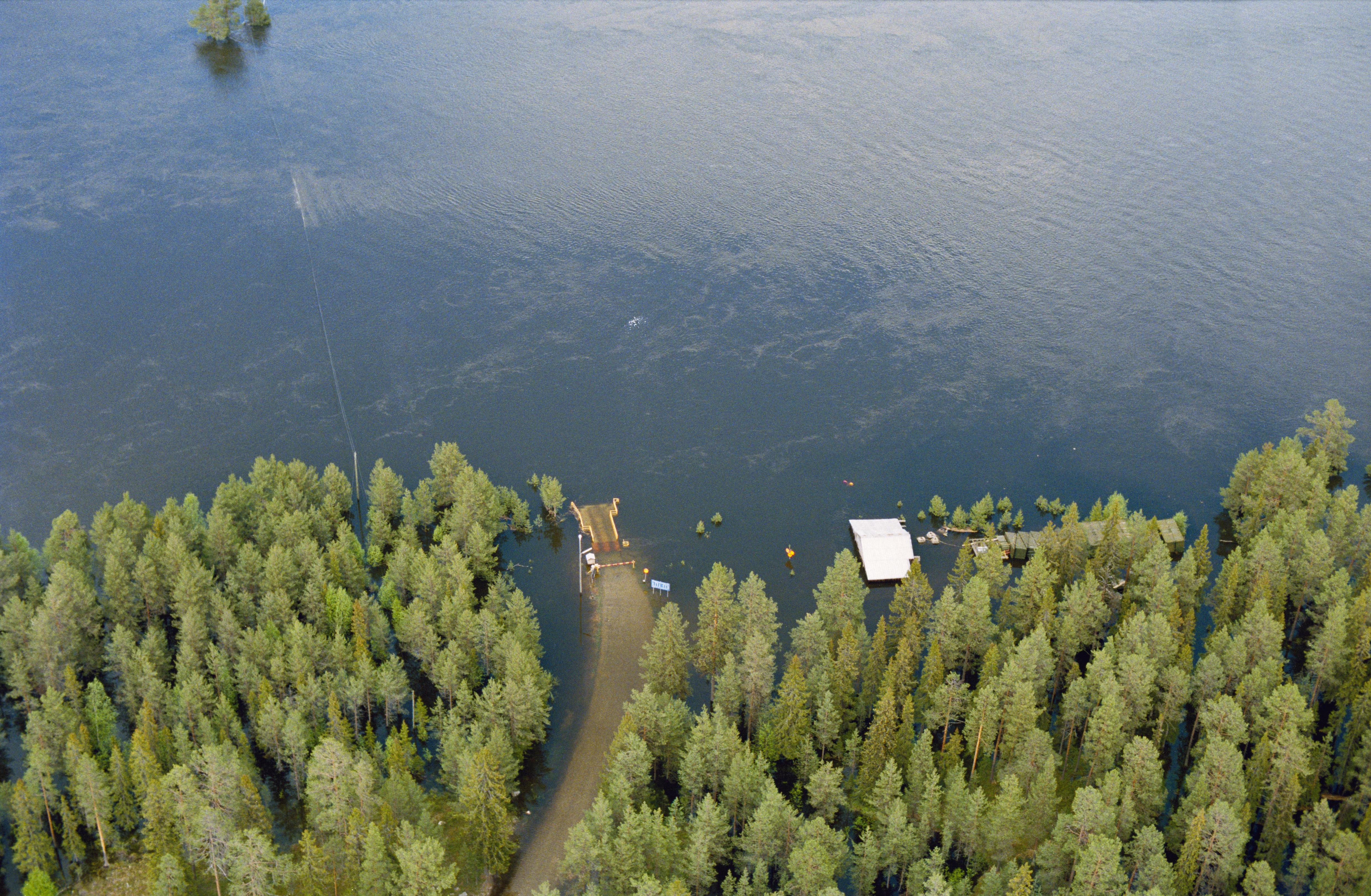 Beskrivning: Vindelälven (Vidduoljiennuo) vid Björksele by och kyrkby (Stuorbiergies). Området är delvis översvämmat efter vårfloden. I bildens nedre del Björksele färjeläge på södra stranden. Bilden är tagen mot (väderstreck): NNO