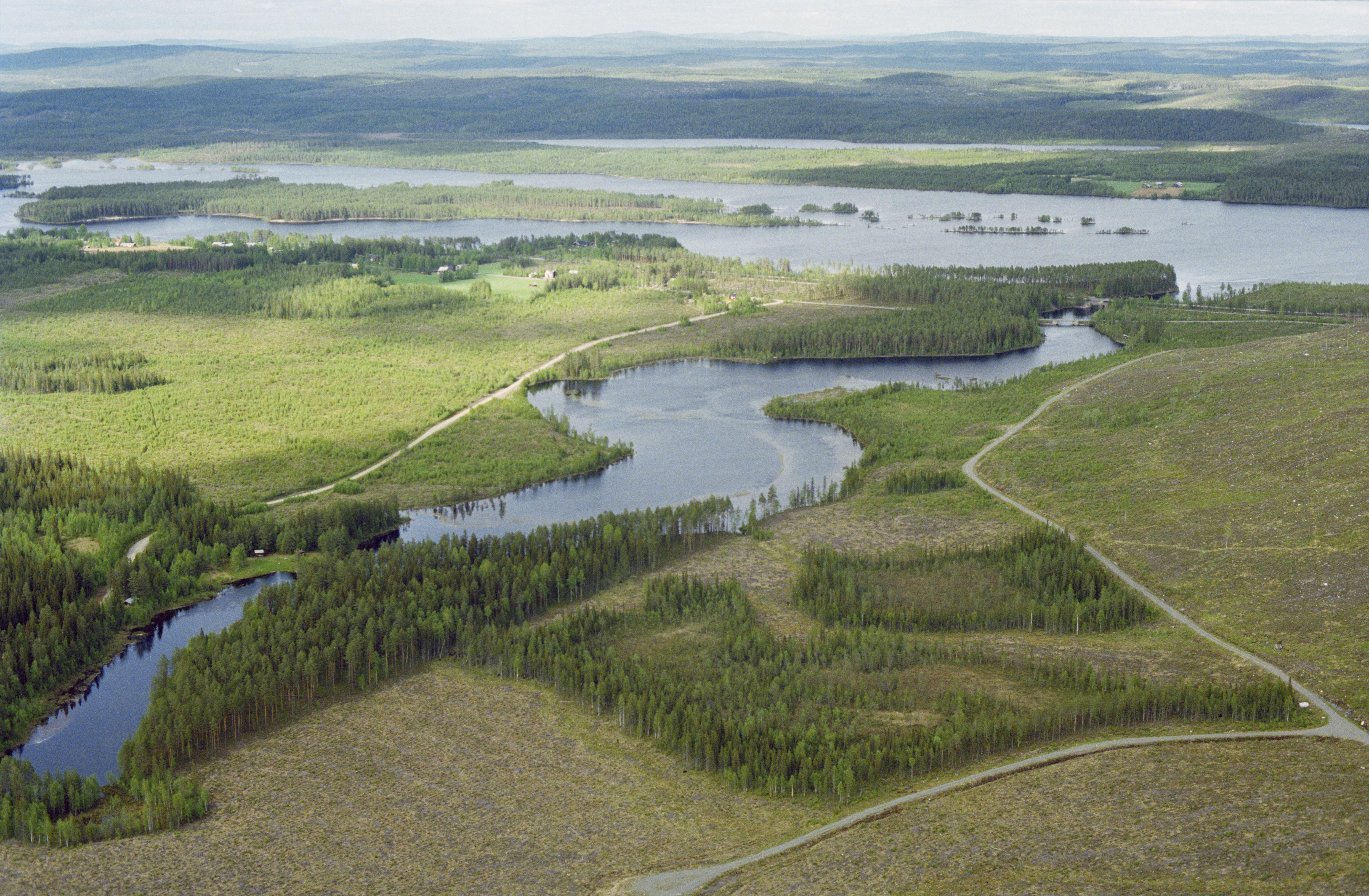 Beskrivning: I bildens nedre del ån Paulbäcken. Vid bäcken nere till vänster om bildens mitt fångstgrop RAÄnr Lycksele 447:1 och boplats Lycksele 1656 m.fl. I bildens övre kant Pausele by vid Umeälven. Bilden är tagen mot (väderstreck): NNO