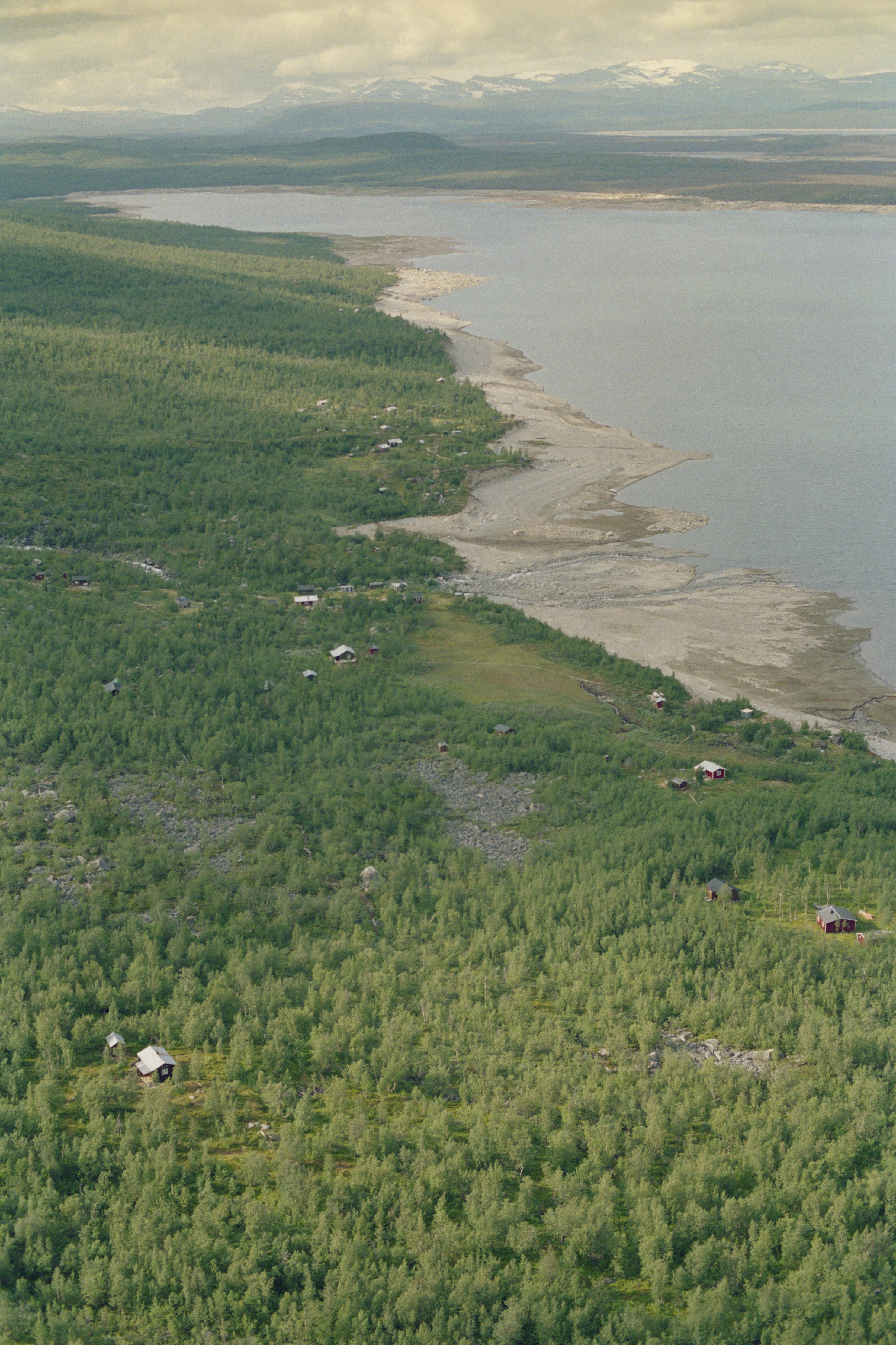 Beskrivning: Vaisaluokta (Vájsáluokta) sommarviste (för Karesuandosamer) vid sjöarna Akkajaure (Áhkájavrre) och Ritsenjaure (Rijtsemjávrre). Torvkåteläger med Vaisaluokta Kåtakyrka. I bildens vänstra kant härd RAÄnr Jokkmokk 3434:1-2. Bilden är tagen mot (väderstreck): NNV