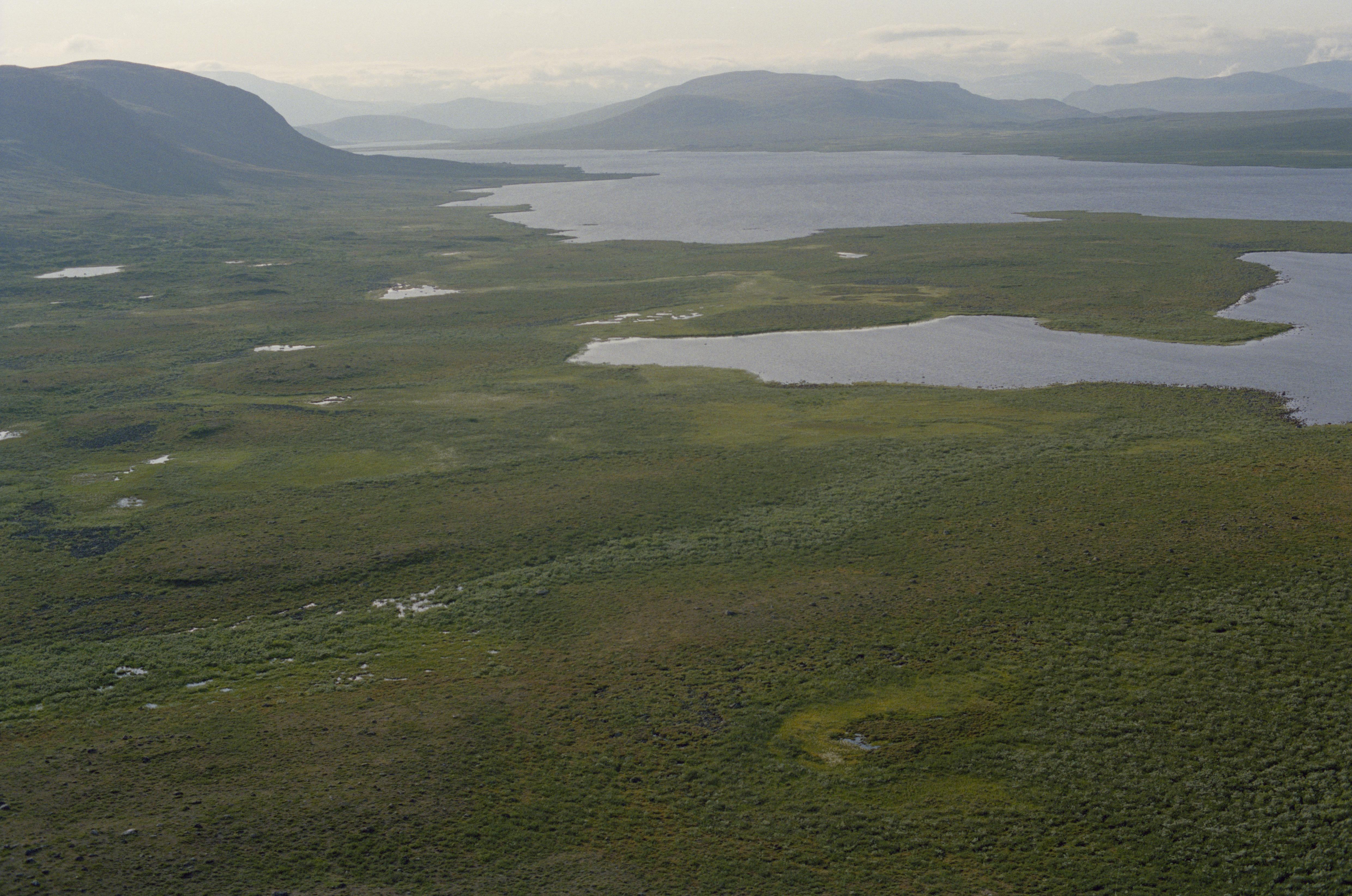 Beskrivning: Sjön Kiepanjaure (Giehpanjávri / Kiehpanjärvi), sydöstra stranden vid området Giehpangielas och stora udden. I bildens övre del fjällen Stuor Tuoipai och Duoibal längs sjöns nordvästra strand. Bilden är tagen mot (väderstreck): VNV