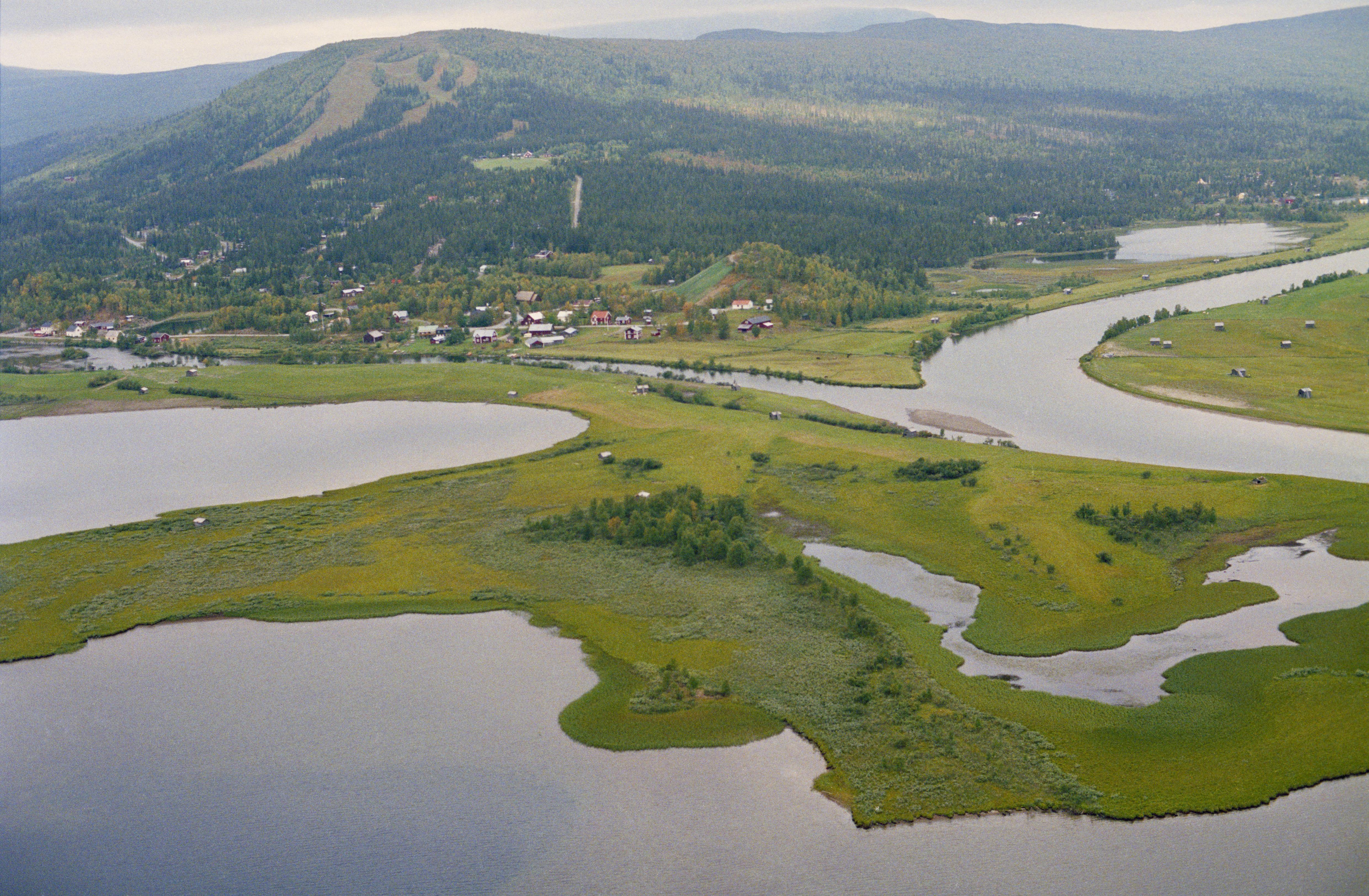 Beskrivning: Deltalandskapet där Tjulån och Vindelälven (Vidduoljiennuo) möts i sjön Gautsträsket (Gávtjávrrie). I bildens övre del Ammarnäs kyrkby (Gávtjávrrie) på Ammarnäset. Ammarnäs kyrka/kapel RAÄnr Sorsele 776:1 vid kullen Potatisbacken över bildens mitt. Bilden är tagen mot (väderstreck): NV
