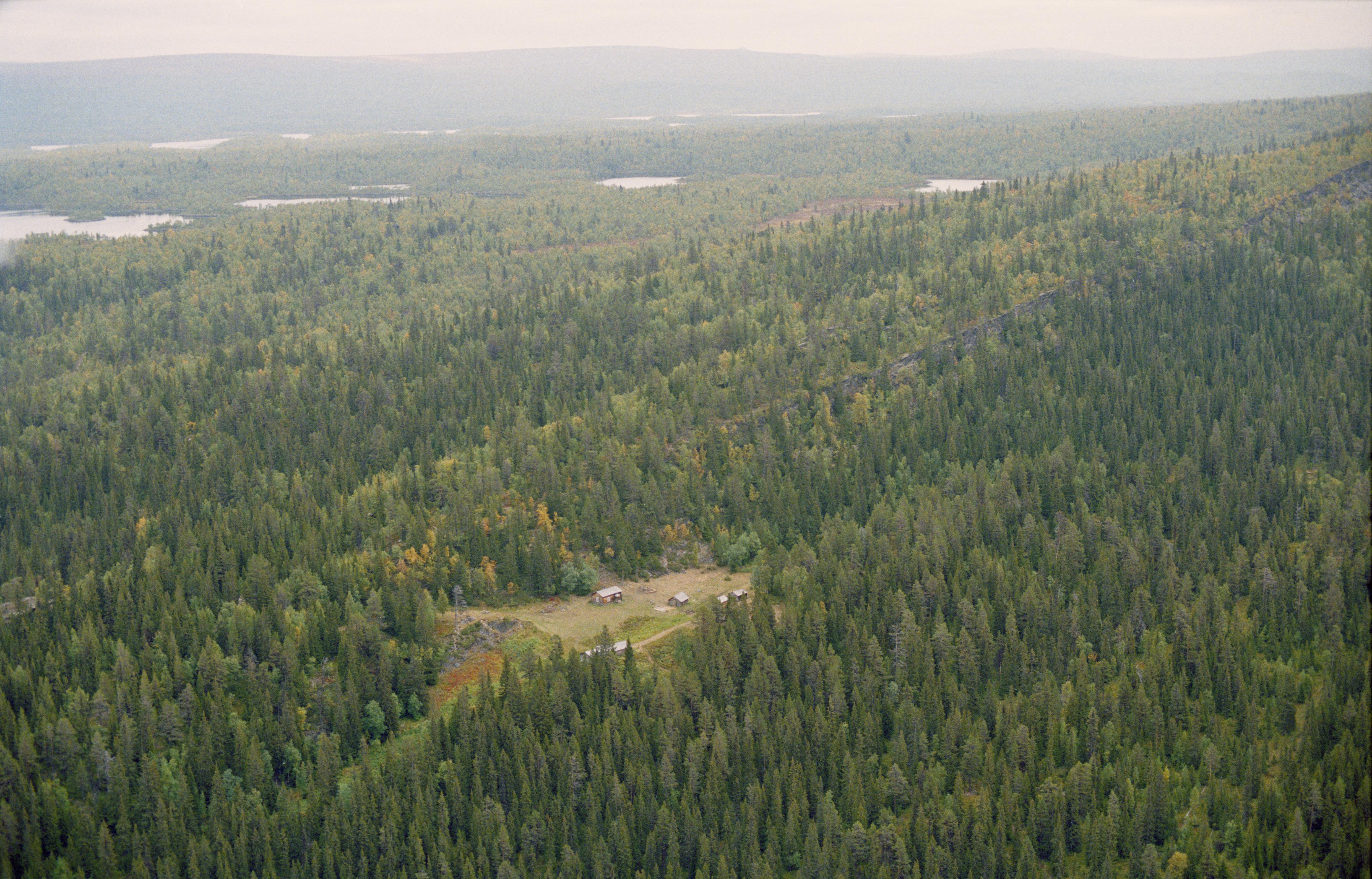 Beskrivning: Nybyggargården Örnbo sydöst om sjön Gautsträsket (Gávtjávrrie). Till vänster i bildens övre del fångstgrop RAÄnr Sorsele 675:1 vid sjön Bissásjávrrie. Området ingår i Vindelfjällens naturreservat. Bilden är tagen mot (väderstreck): NO