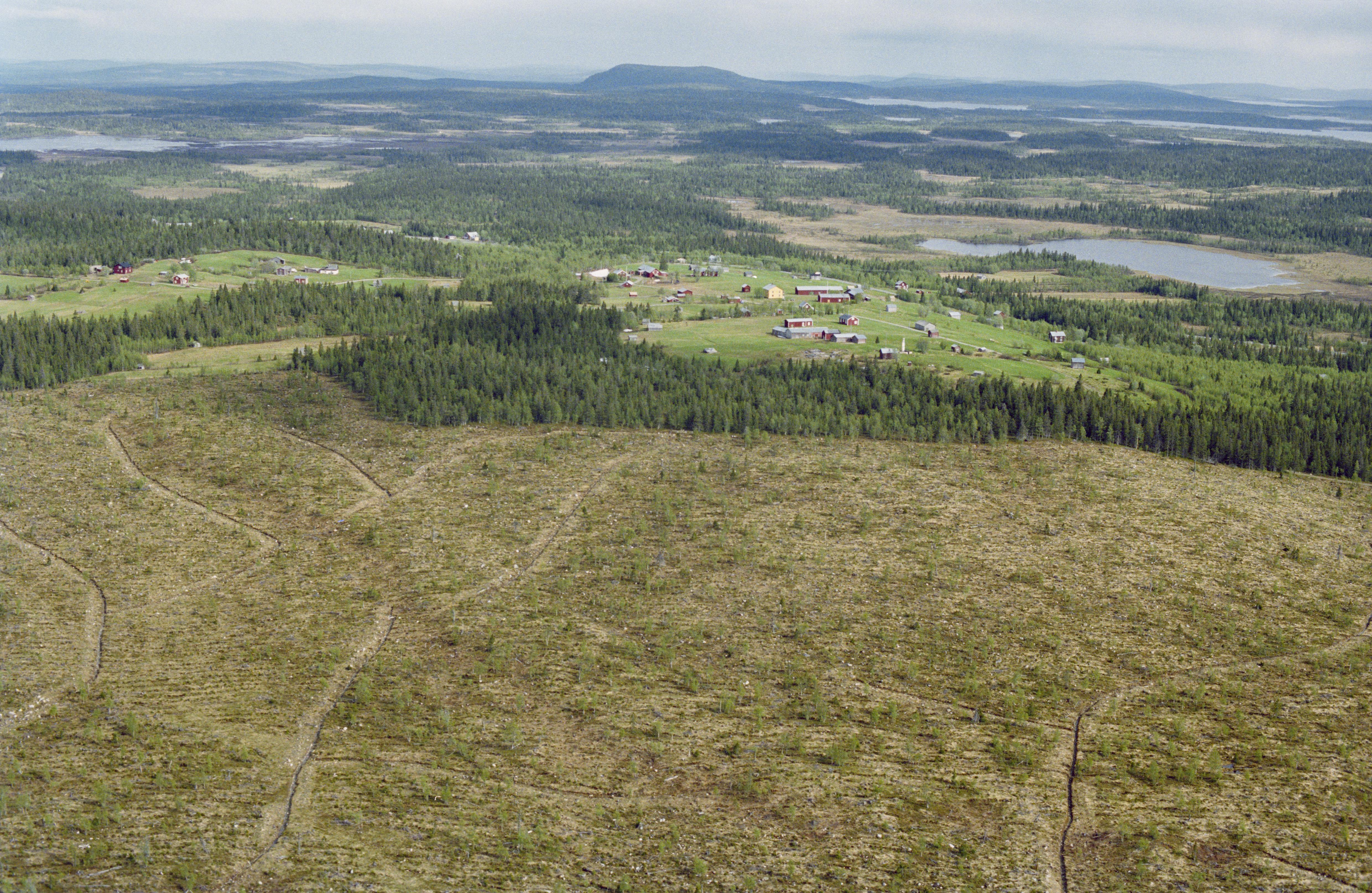 Beskrivning: Över bildens mitt Risträsks by med husgrund RAÄnr Vilhelmina 692:1 och Risträskskogens naturreservat. I bildens övre kant myrområdet Träskmyran och sjön Risträsket. Bilden är tagen mot (väderstreck): Ö