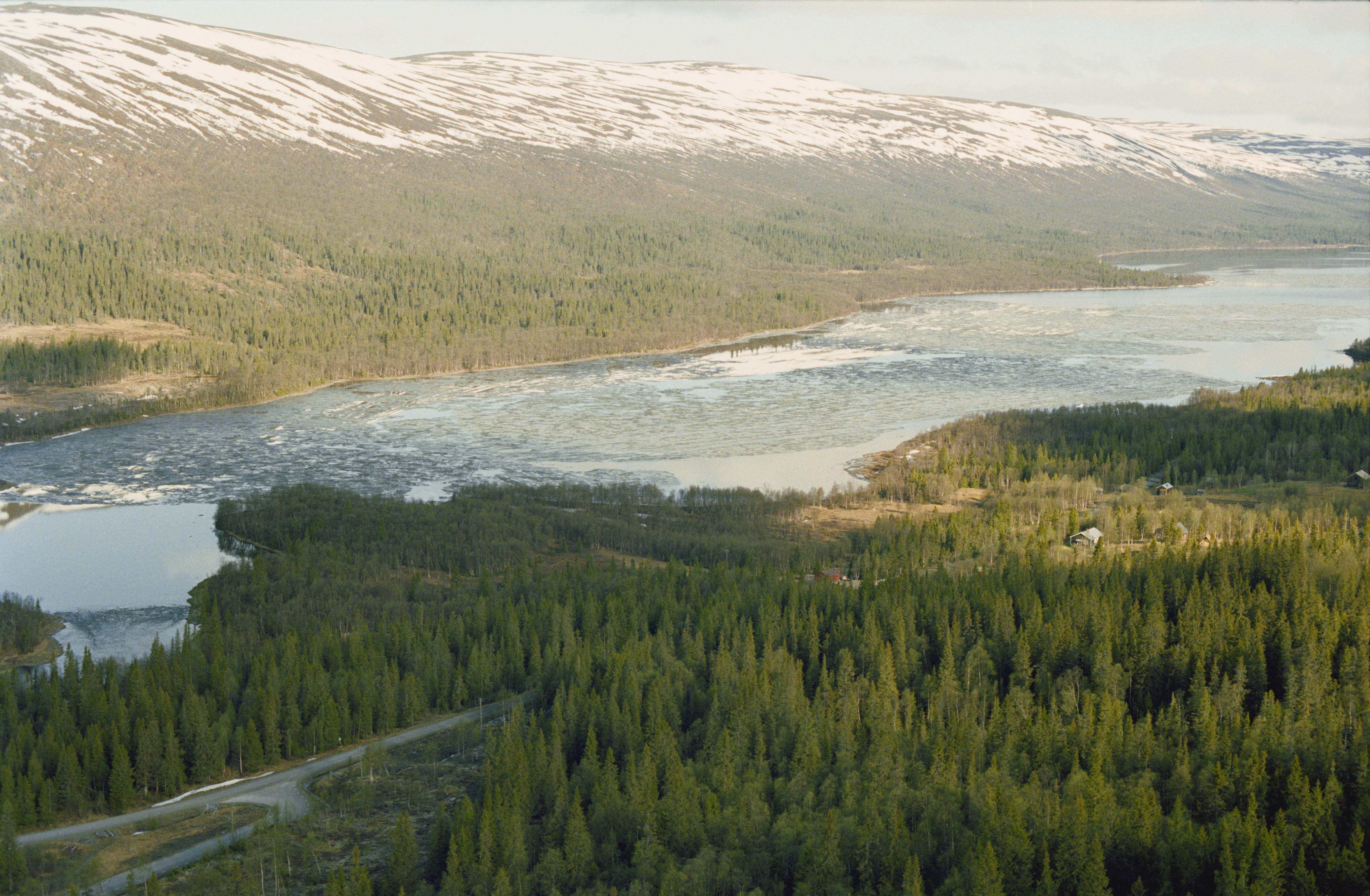 Beskrivning: Gikasjön, sydöstra stranden, söder om Grundfors by. I bildens mitt Slipbäckens mynning i Gikasjön. Vid stranden på sjöns västra sida (över bildens mitt) flera fyndplatser, fångstgrop RAÄnr Vilhelmina 1103:1, boplats Vilhelmina 1112:1 m.m. Bilden är tagen mot (väderstreck): NV
