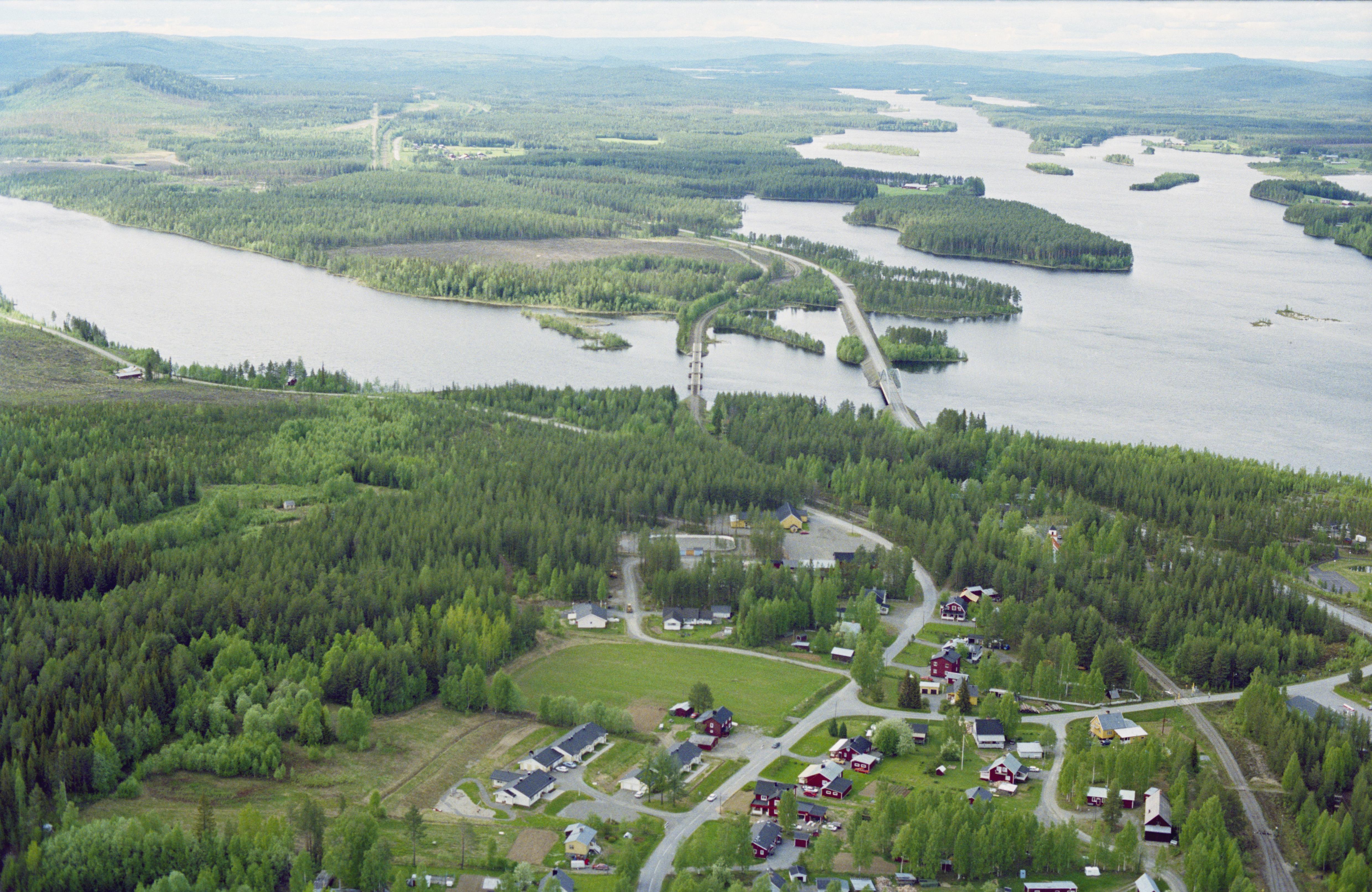 Beskrivning: Åskiljeby (Geäddiedievvá) vid sjön Åskilje (Jeanoejåakoe) där Umeälven (till vänster) sammanflöder med Juktån. Vid den högra bron (RAÄnr Stensele 61:1) vid bildens mitt en boplats RAÄnr Stensele 52:1. Åskilje kyrka till höger under bildens mitt. Bilden är tagen mot (väderstreck): NV