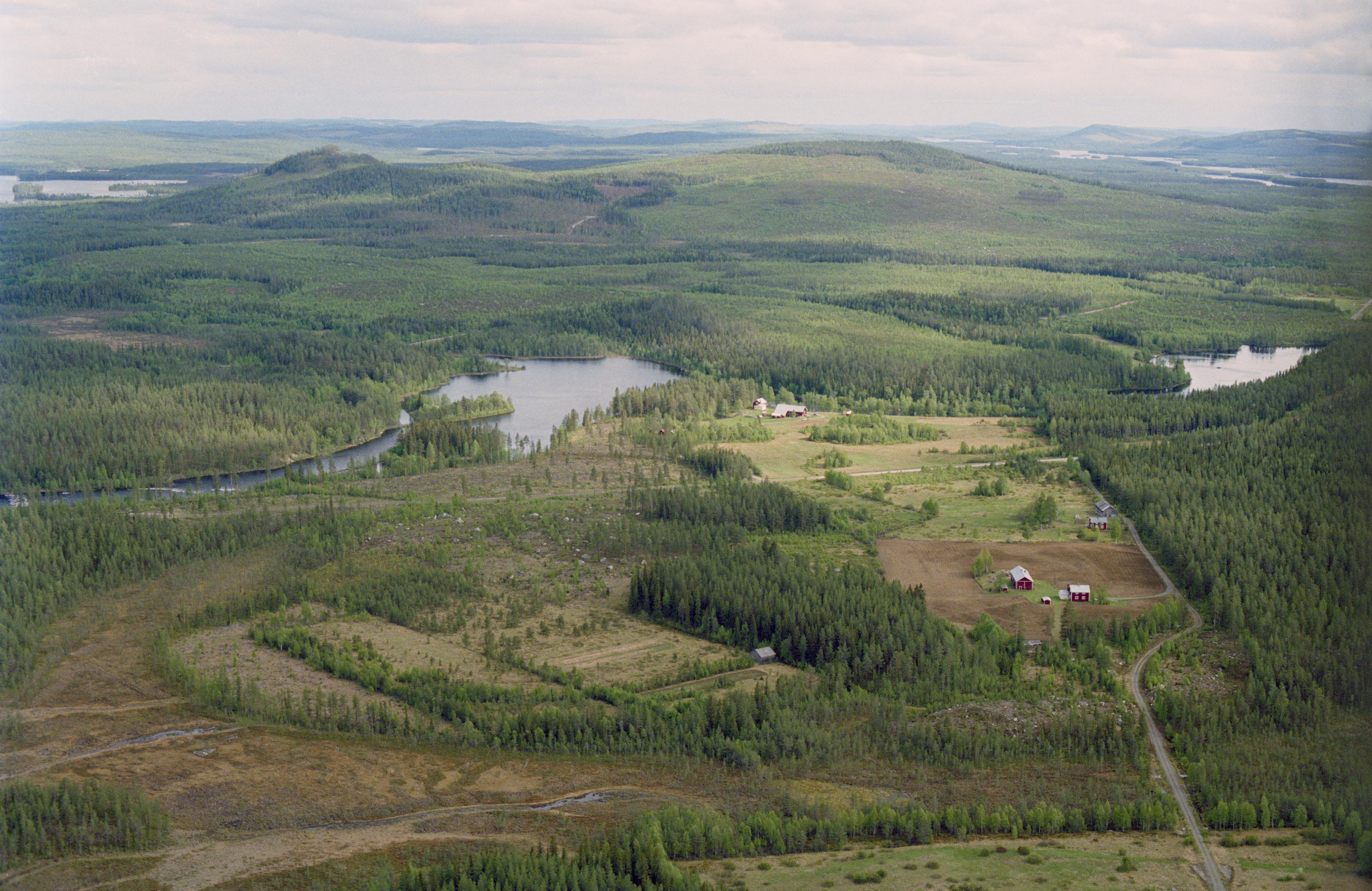 Beskrivning: I bildens nedre del området Nyland, nordöst om orten Gunnarn och väster om Juktån. I bildens mitt och nedre del torp i Juktåkolonin som är en grupp kronolägenheter / torp i områdena vid Juktån och orten Gunnarn. Längs Juktån vid bildens mitt fångstgropar RAÄnr Stensele 1166 m.fl. Bilden är tagen mot (väderstreck): SSO
