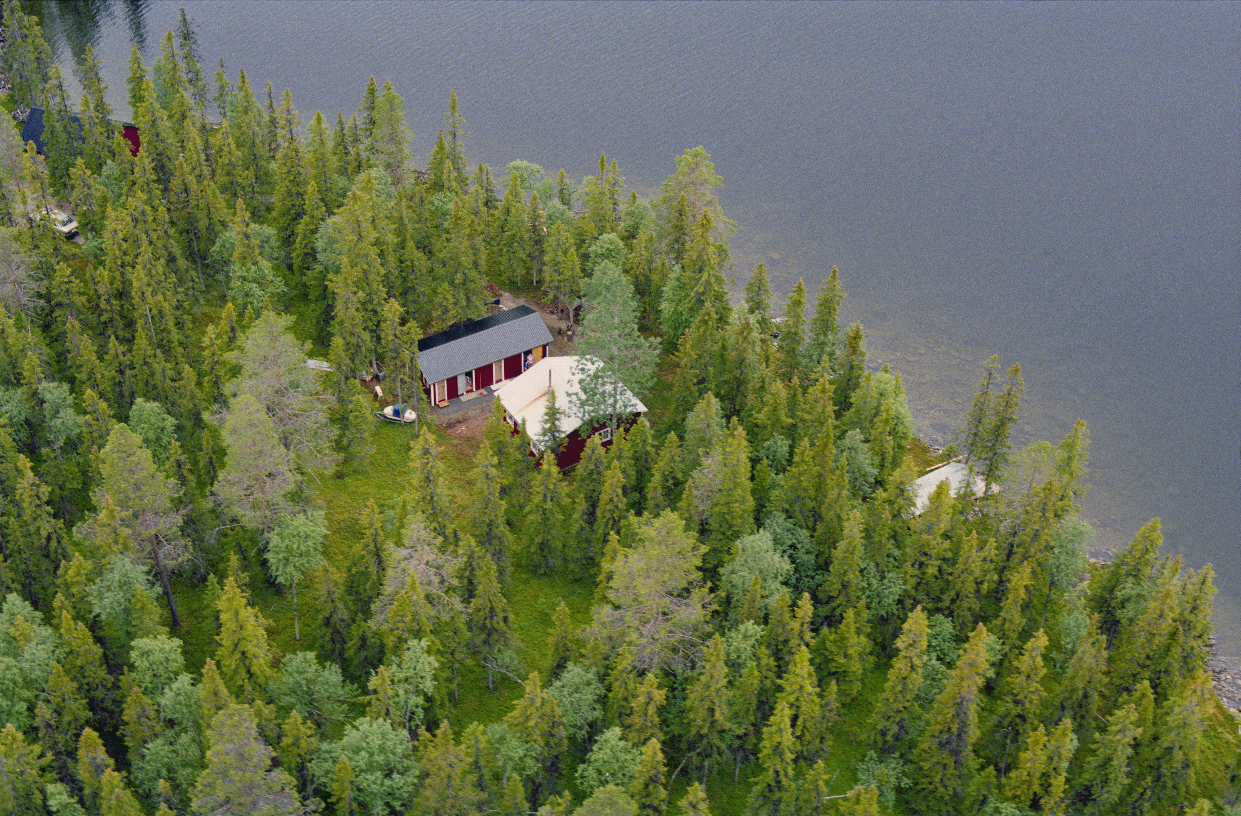 Beskrivning: Fritidshus norr om bergsområdena Geavmoeasie och Vinberget vid Rönnbäckssjöns södra strand, väster i sjön Lill-Björkvattnet (Bearkede). Bilden är tagen mot (väderstreck): VNV