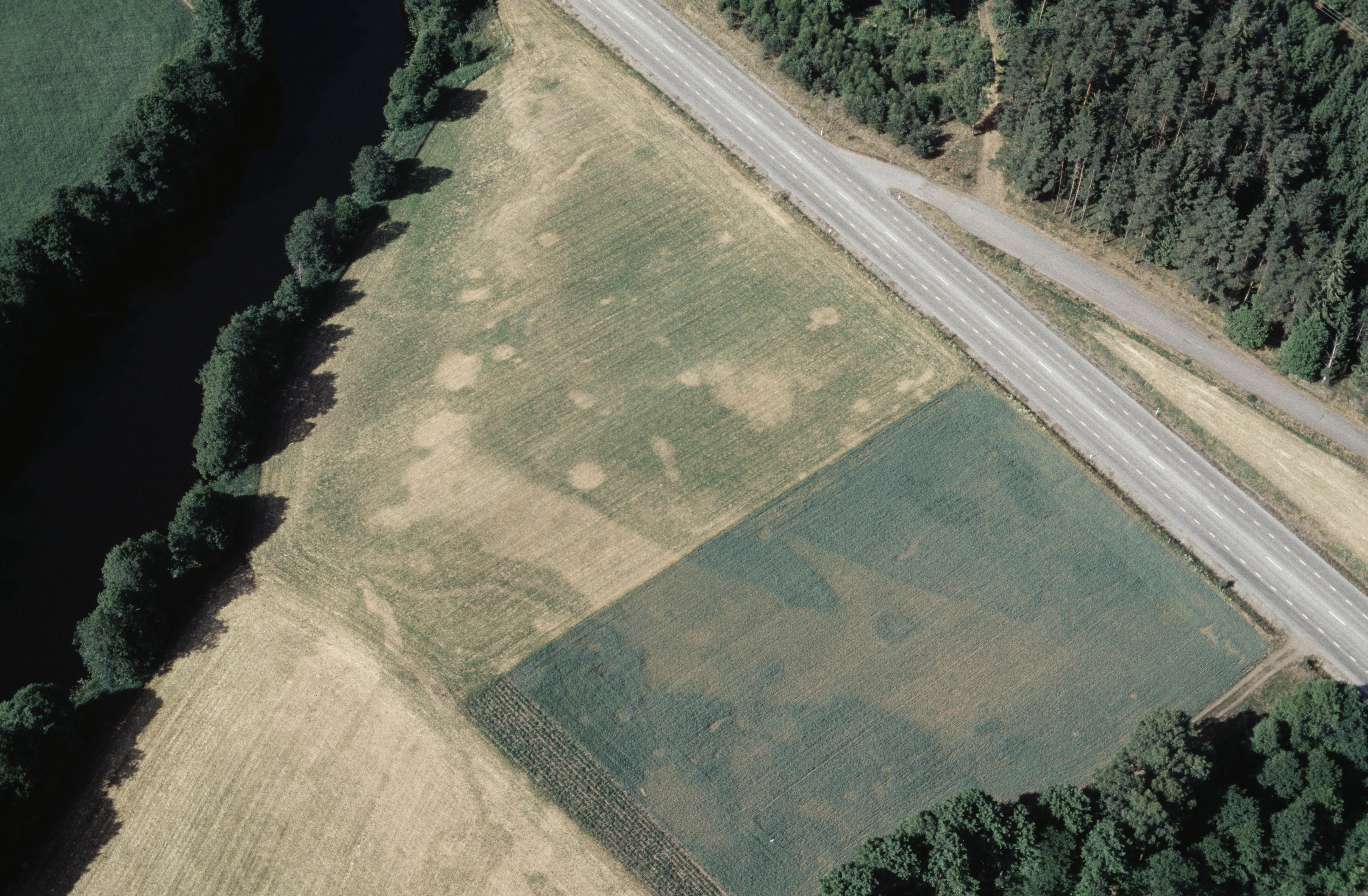 Beskrivning: Ån Lagan vid Fridhem och Bredemad. Vid bildens mitt cropmarks i åker nära fossil åker RAÄnr Kånna 86:1 och bytomt Kånna 59:3. Bilden är tagen mot (väderstreck): SV
