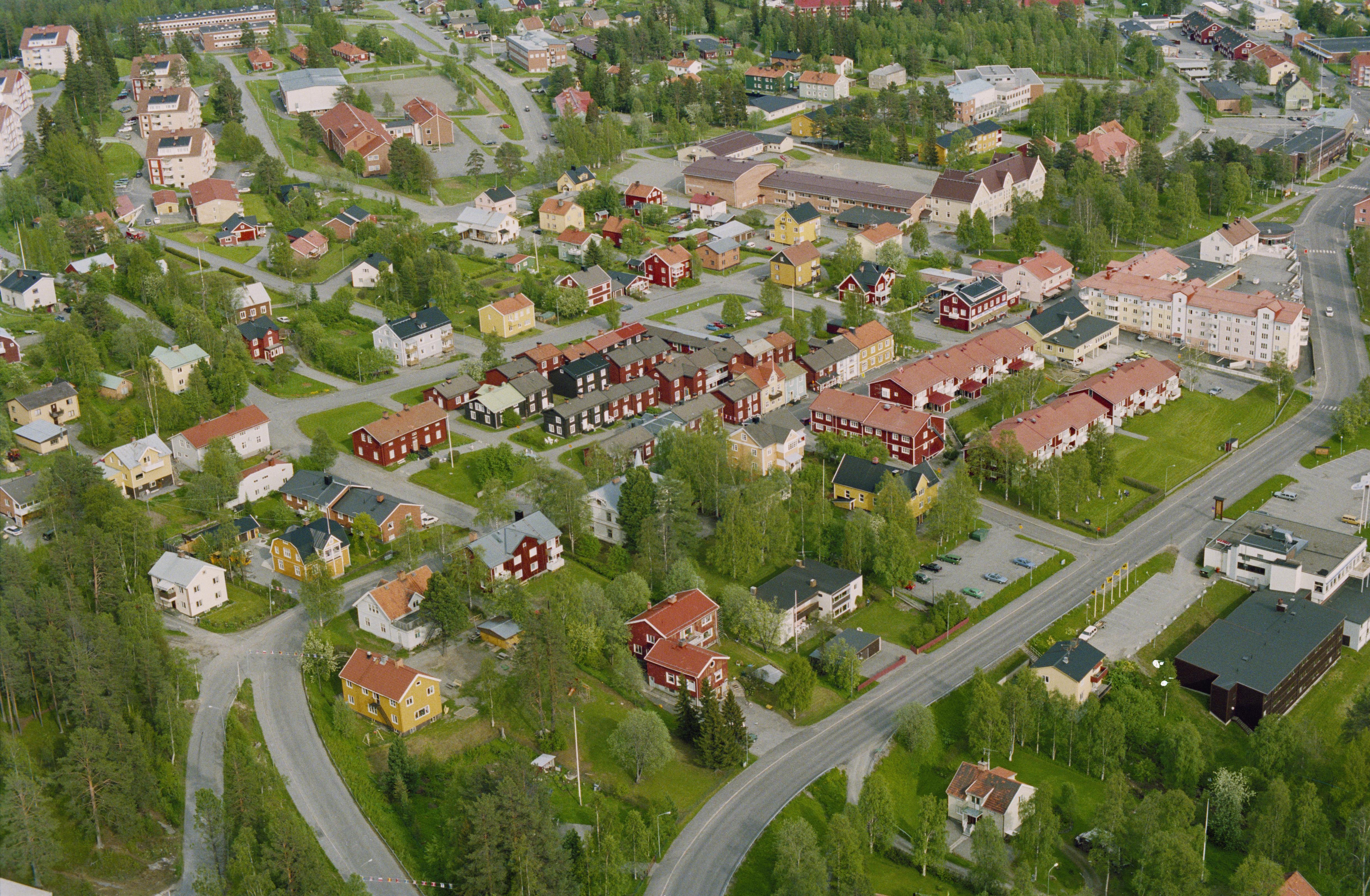 Beskrivning: Vilhelmina tätort (Vualtjere), kyrkby och stationsamhälle i Vojmåns dalgång. Vid bildens mitt Vilhelmina kyrkstad. Till vänster om kyrkstaden byggnadsminnet och bostaden Skollägdan 11. Bilden är tagen mot (väderstreck): SO