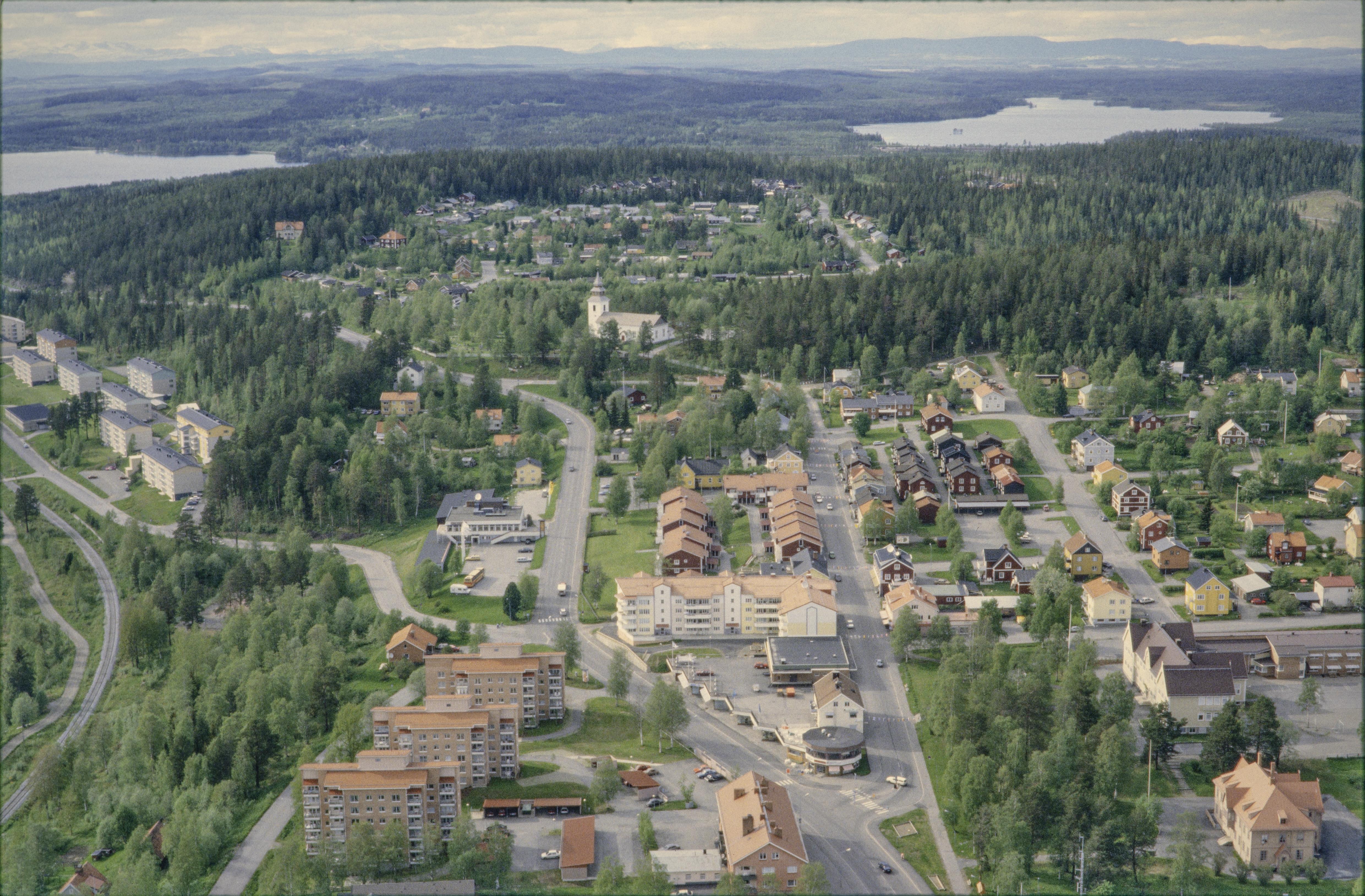 Beskrivning: Vilhelmina tätort (Vualtjere), kyrkby och stationsamhälle i Vojmåns dalgång mellan sjöarna Volgsjön och Baksjön. Vilhelmina kyrka, Vilhelmina kyrkstad och och byggnadsminnet Skollägdan 11 i och över bildens mitt. I bildens vänstra kant boplats RAÄnr Vilhelmina 309:1. Bilden är tagen mot (väderstreck): NV