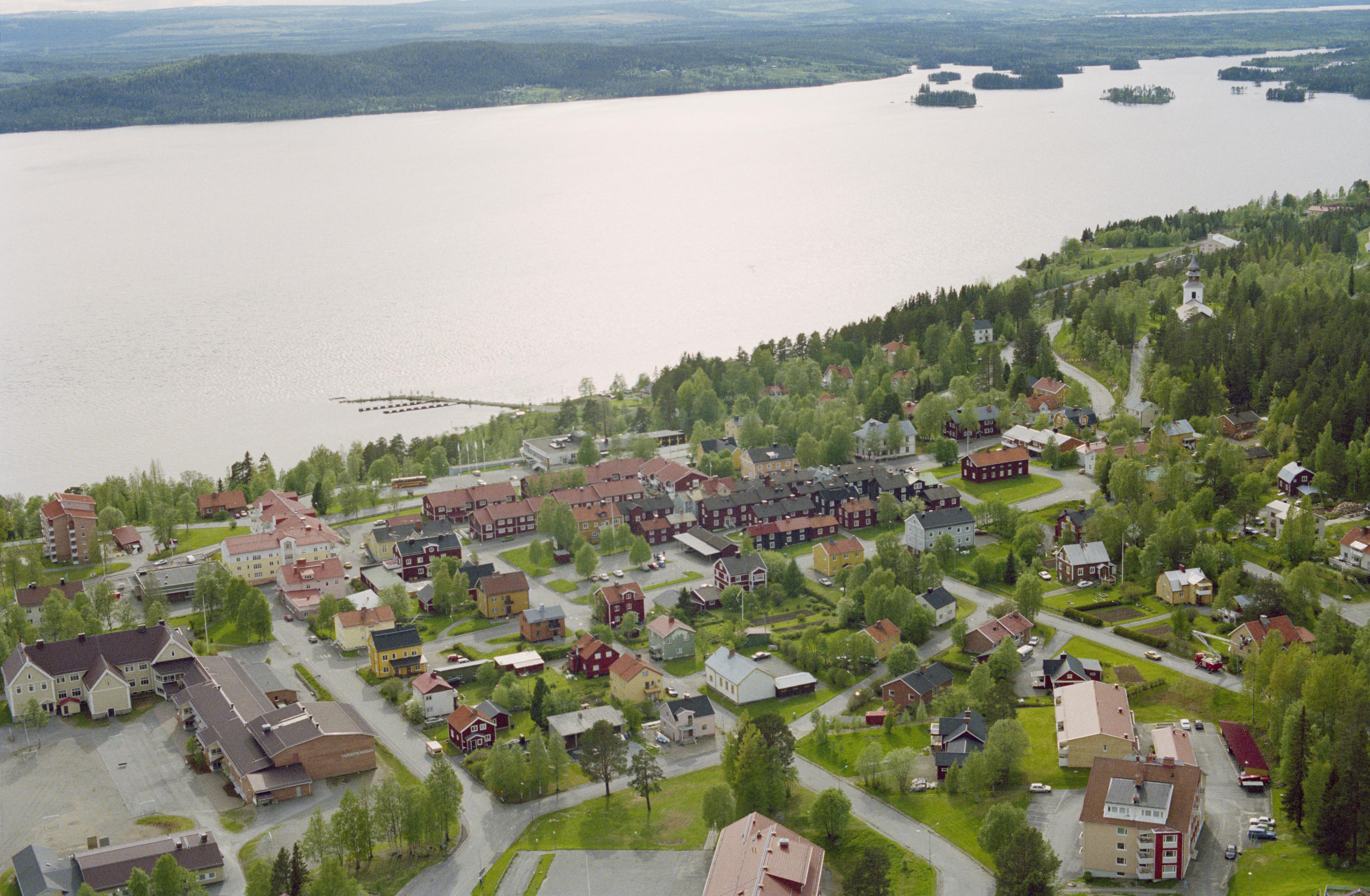 Beskrivning: Vilhelmina tätort (Vualtjere), kyrkby och stationsamhälle i Vojmåns dalgång. Volgsjön i bildens övre del. Vilhelmina kyrka uppe till höger. Vilhelmina kyrkstad och byggnadsminnet Skollägdan 11 i och under bildens mitt. På stranden över bildens mitt boplats RAÄnr Vilhelmina 309:1. Bilden är tagen mot (väderstreck): V