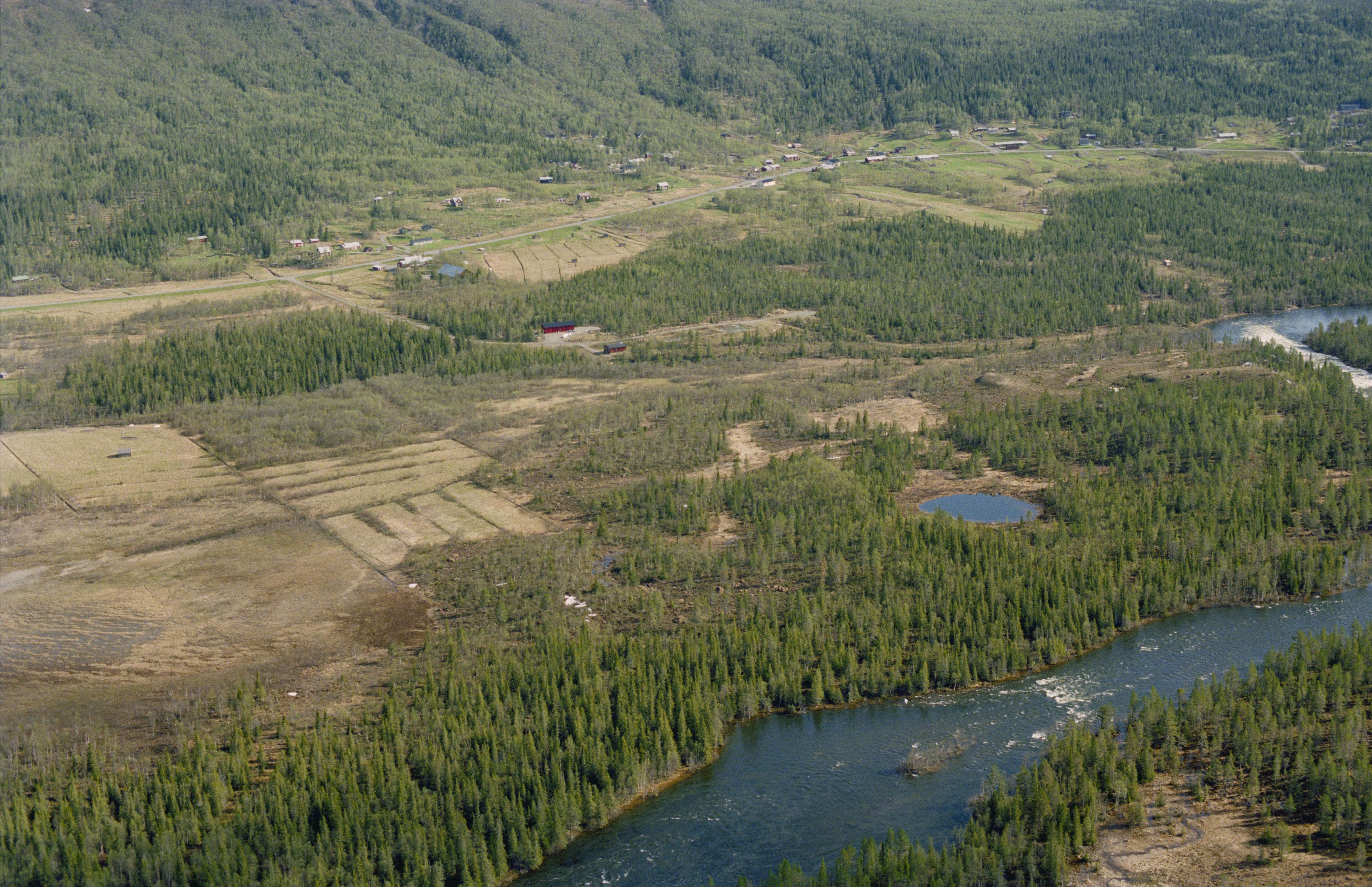 Beskrivning: Orten Kittelfjäll under fjälltopparna Kittelfjället (Stuore Giebnie) och Henriksfjället (Onne Giemnie) i Vojmåns dalgång. Vid ån nere till höger en fyndplats (skärvsten) RAÄnr Vilhelmina 1086:1. Bilden är tagen mot (väderstreck): NNO