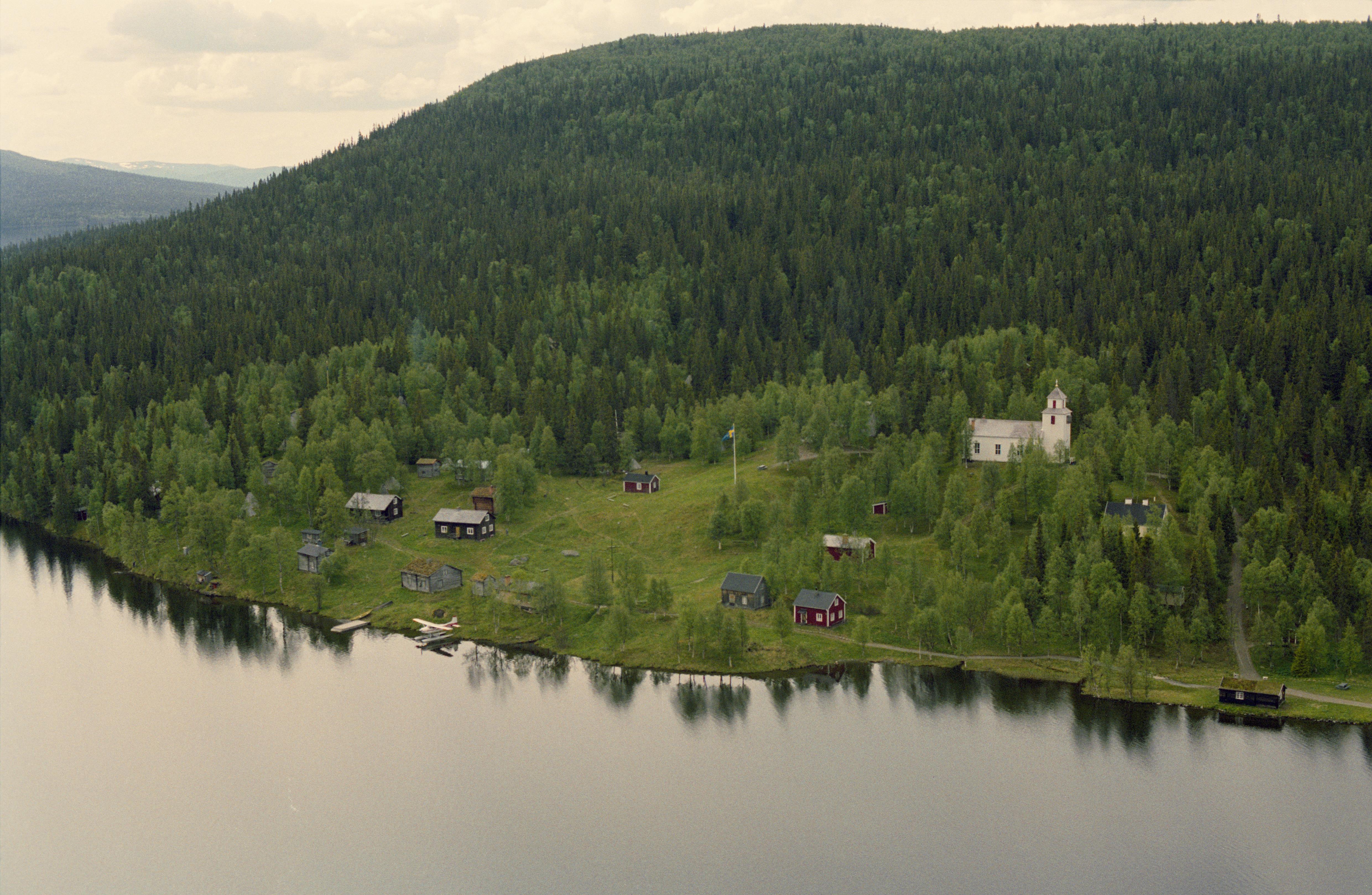 Beskrivning: Fatmomakke (Faepmie) kulturreservat och kyrkstad vid Fatmomakkeviken i norra ändan av Kultsjön (Gåaltoe). Fatmomakke kapell till höger om bildens mitt. Vid kyrkstaden boplats RAÄnr Vilhelmina 46:1 m.m. Bilden är tagen mot (väderstreck): SSO