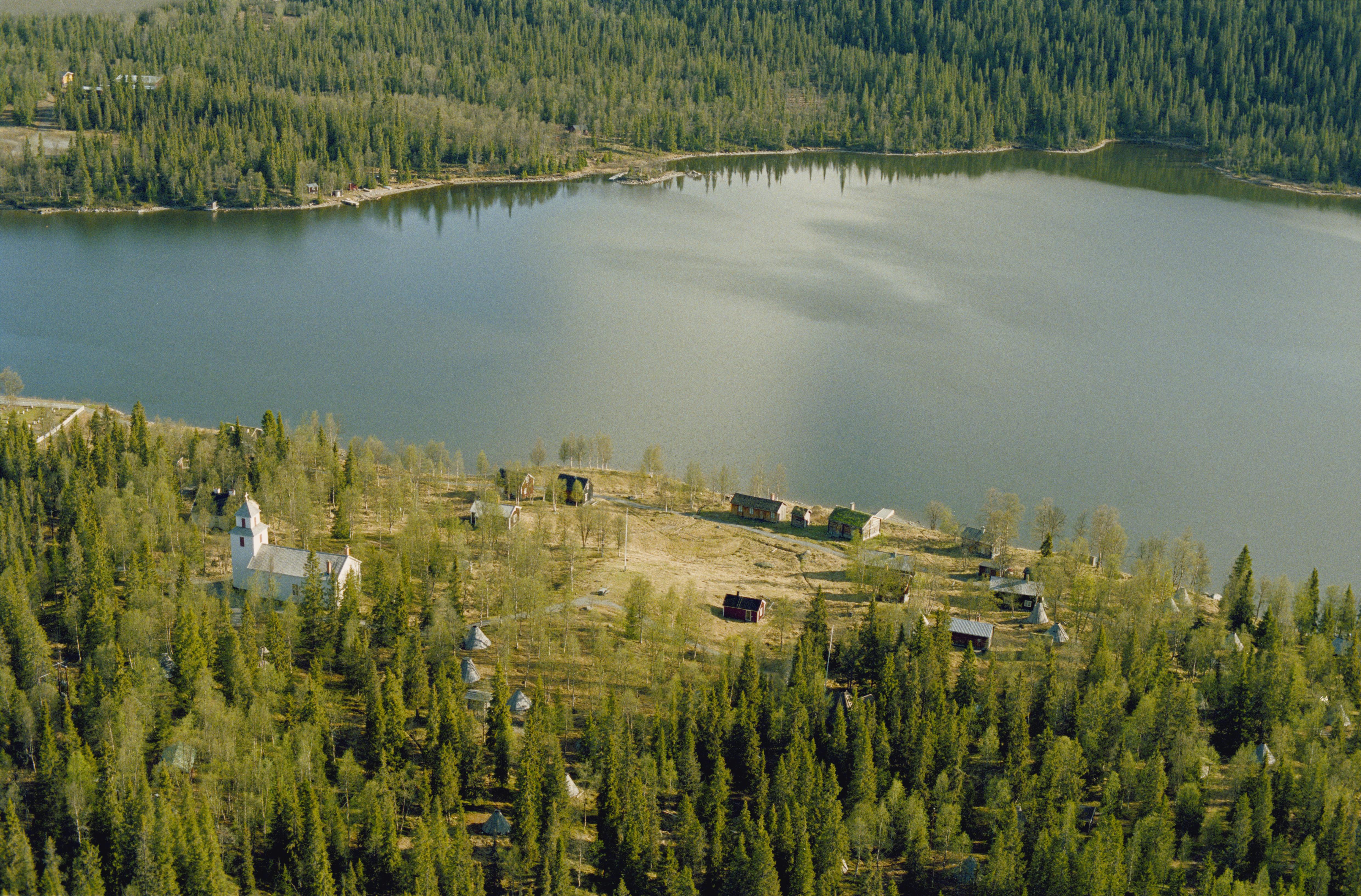 Beskrivning: Fatmomakke (Faepmie) kulturreservat och kyrkstad vid Fatmomakkeviken i norra ändan av Kultsjön (Gåaltoe). Fatmomakke kapell till vänster under bildens mitt. Vid kyrkstaden offerplats RAÄnr Vilhelmina 66:1 m.m. Bilden är tagen mot (väderstreck): NNV