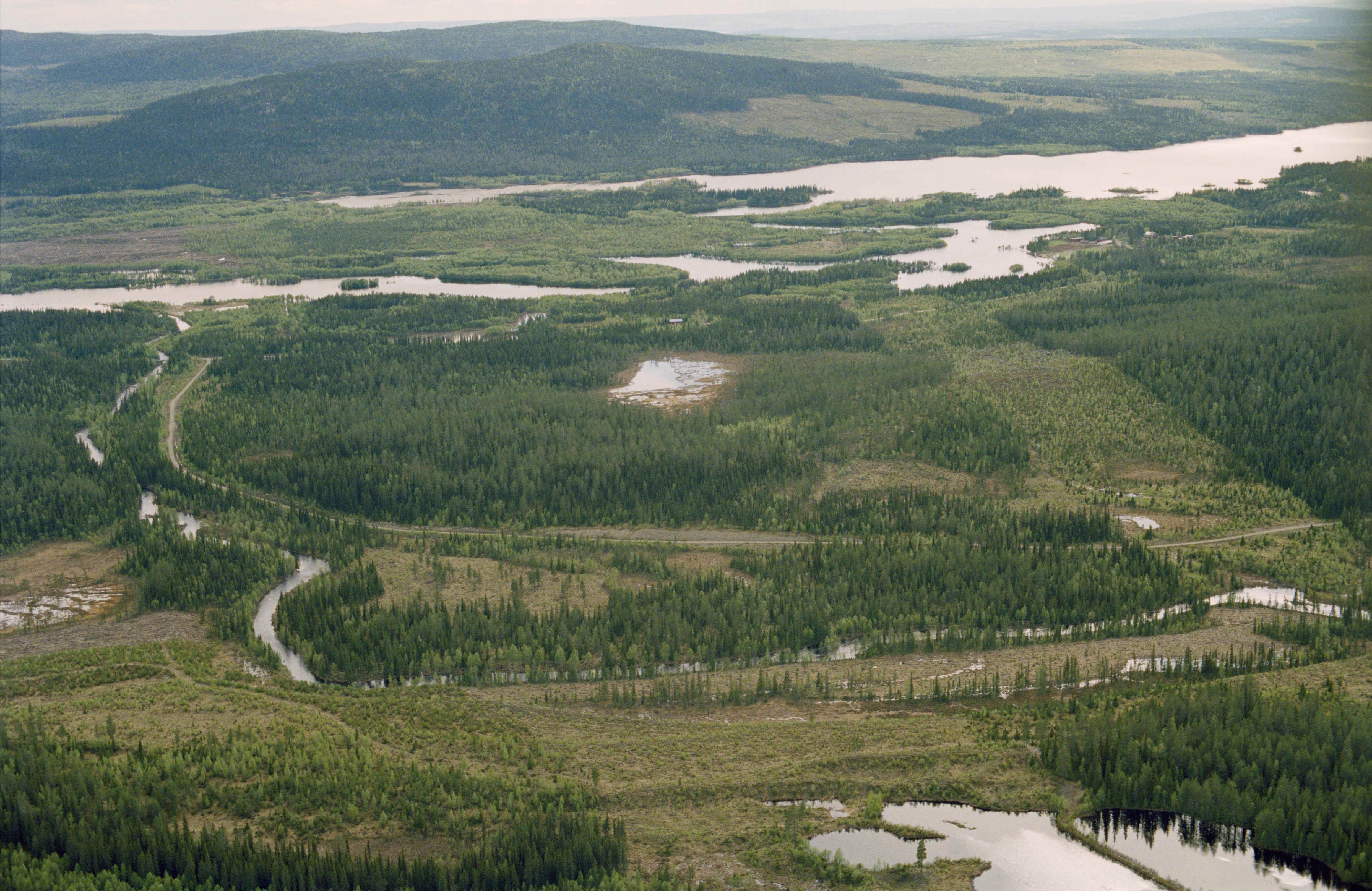 Beskrivning: Fångstmiljö i området mellan Gråtanån och Vojmån i Vojmsjöns sydöstra ände. Område med flera boplatser och fångstgropssystem. Vid tjärnen nere till höger fångstgrop RAÄnr Vilhelmina 1203:1. Vid bildens mitt boplats RAÄnr Vilhelmina 568:1 m.fl. Bilden är tagen mot (väderstreck): SSV