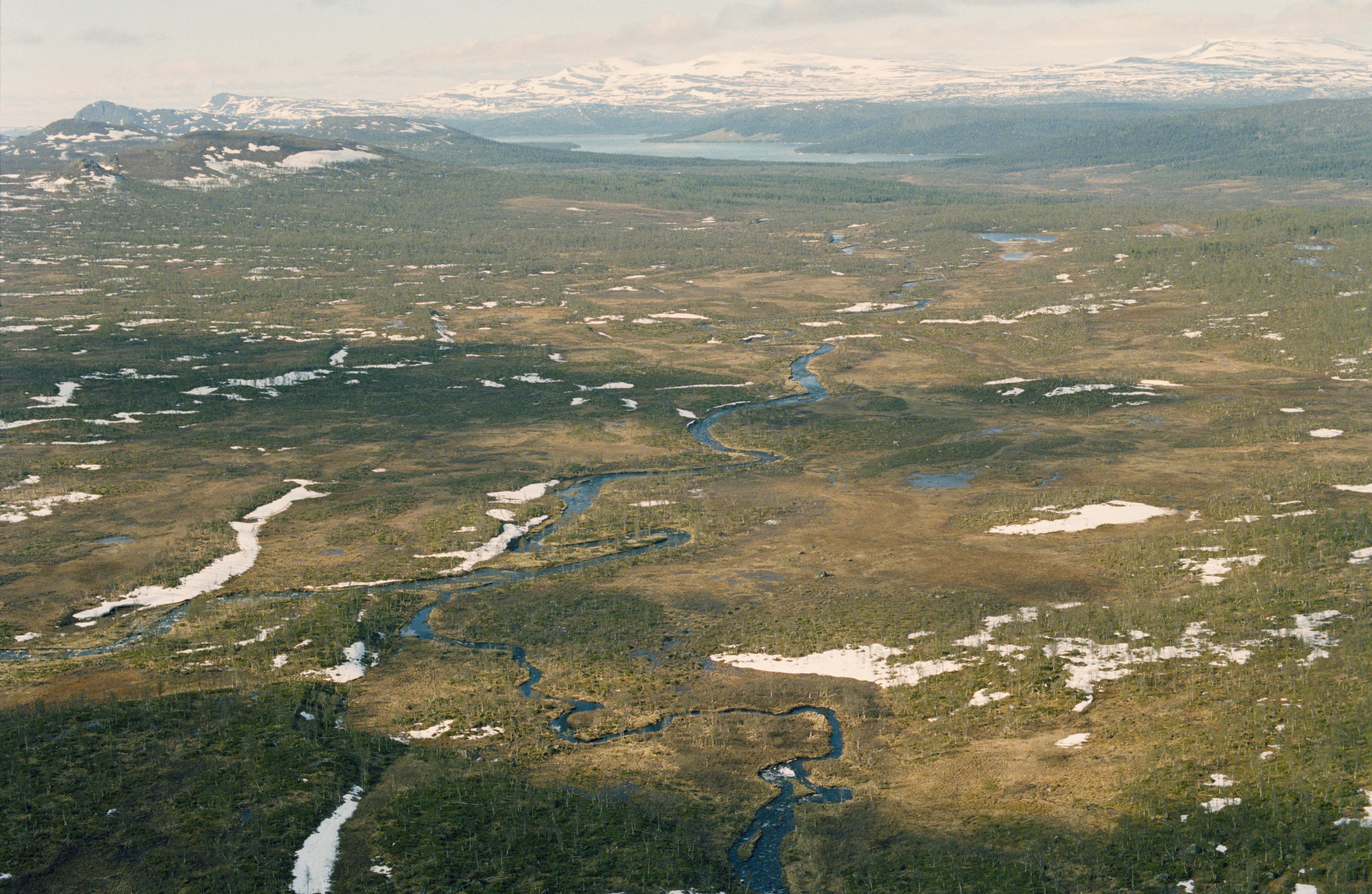 Beskrivning: Norra delen av Svartsjöbäcken (Tjeehpesjohke) och dalgången mot Kultsjön. I bildens nedre kant offerplats RAÄnr Vilhelmina 1584:1-3. Över bildens mitt sammanflödet med Djupbäcken från Marsfjället och längre upp med Oxbäcken. Ingår i Marsfjällets naturreservat. Bilden är tagen mot (väderstreck): SSV